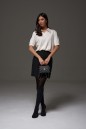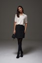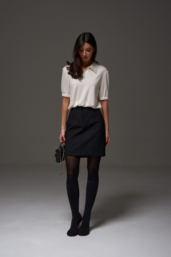 Юбка прямого кроя выполнена из текстильного полотна черного цвета. Характеристики: прямой крой, брендированная подкладка, пояс стабильный, застежка молния и пуговичка, по передней и задней части изделия вертикальные прямые рельефы. Длина юбки 47 см.