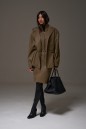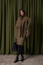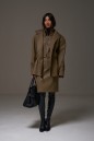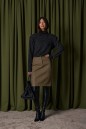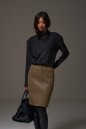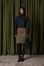 Юбка полуприлегающего силуэта выполнена из эко-кожи цвета хаки с теснением. Характеристики: стабильный пояс, застёжка центральная пуговица, молния, на брендированной подкладке, по передней и задней части изделия декоративные строчки, в среднем шве разрез 11 см. Длина изделия по боковому шву 59 см.