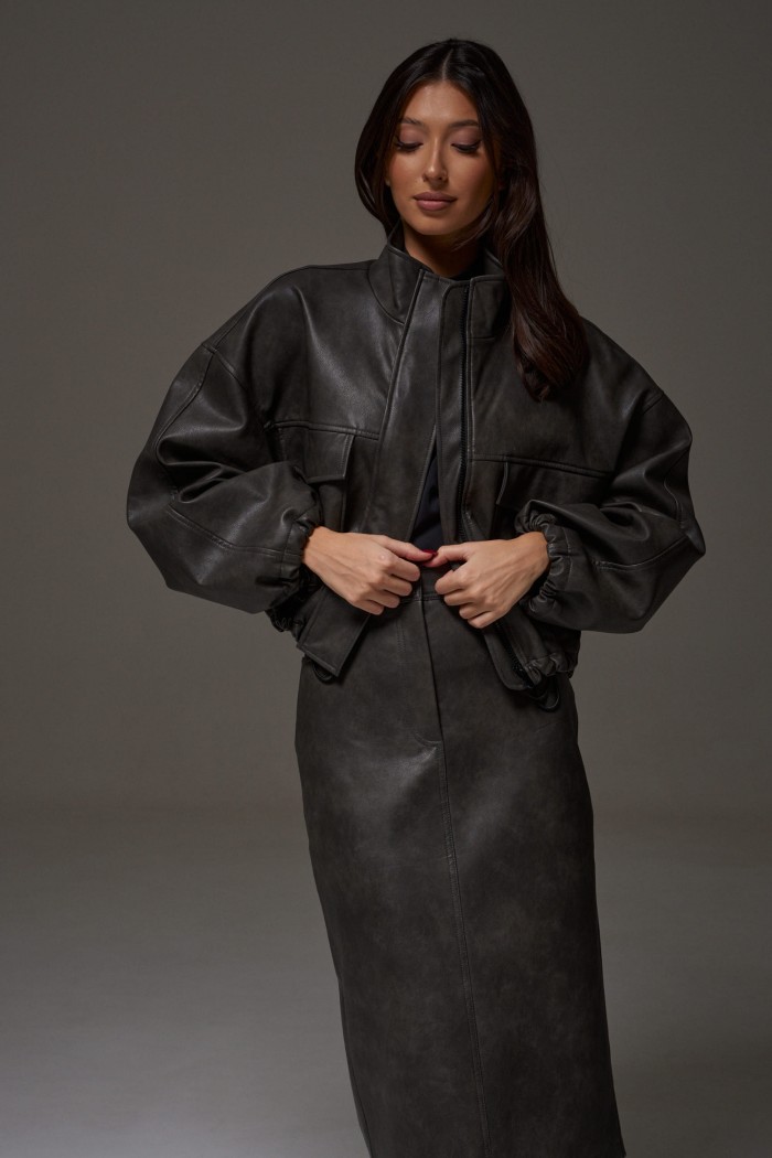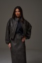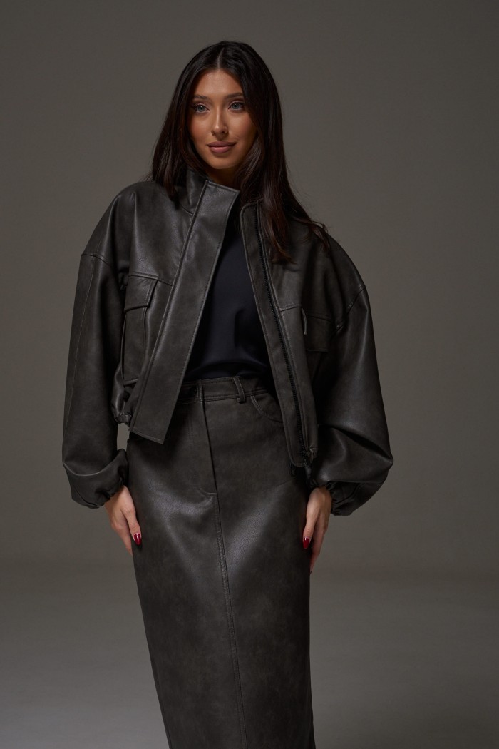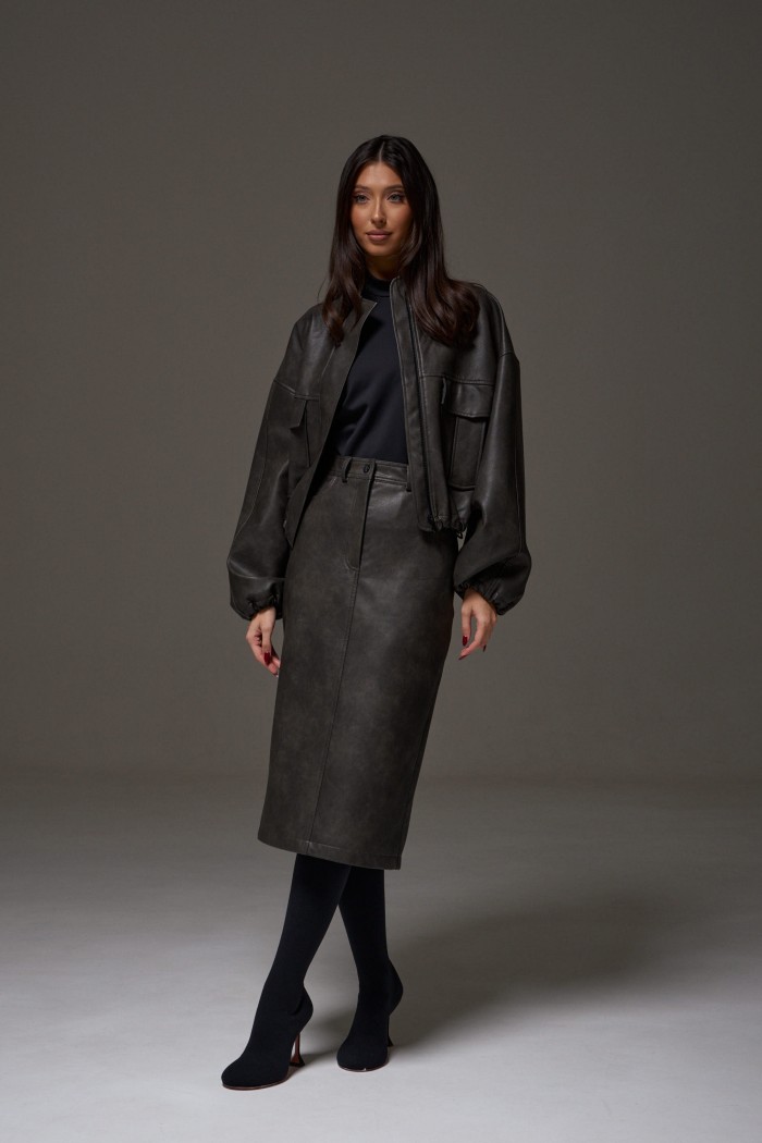 Юбка прямого кроя выполнена из экокожи. Характеристики: прямой крой, пояс стабильный со шлевками, на брендированной подкладке, застёжка центральная пуговица, молния, по передней части изделия прорезные карманы, по заднему полотну накладные карманы. Длина 75 см. В среднем шве разрез 32 см.