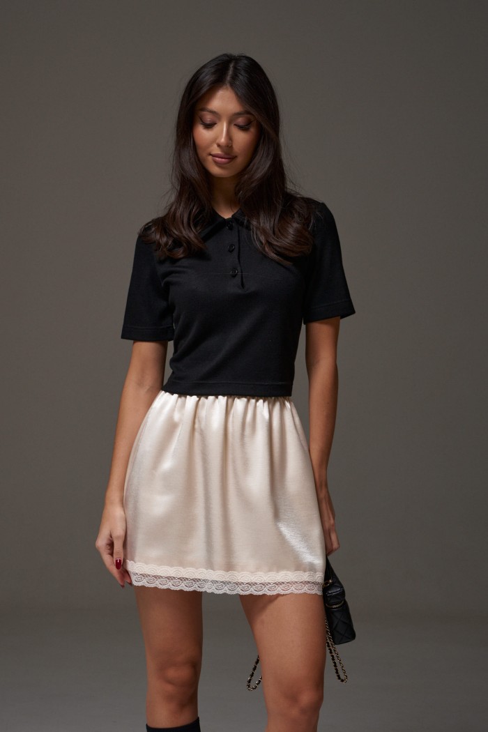 Юбка прямого кроя, выполнена из струящейся ткани молочного цвета. Характеристики: прямой крой, на подкладке, пояс на резинке, по низу изделия пришито кружево . Длина по боковому шву 43 см (с учетом кружева).