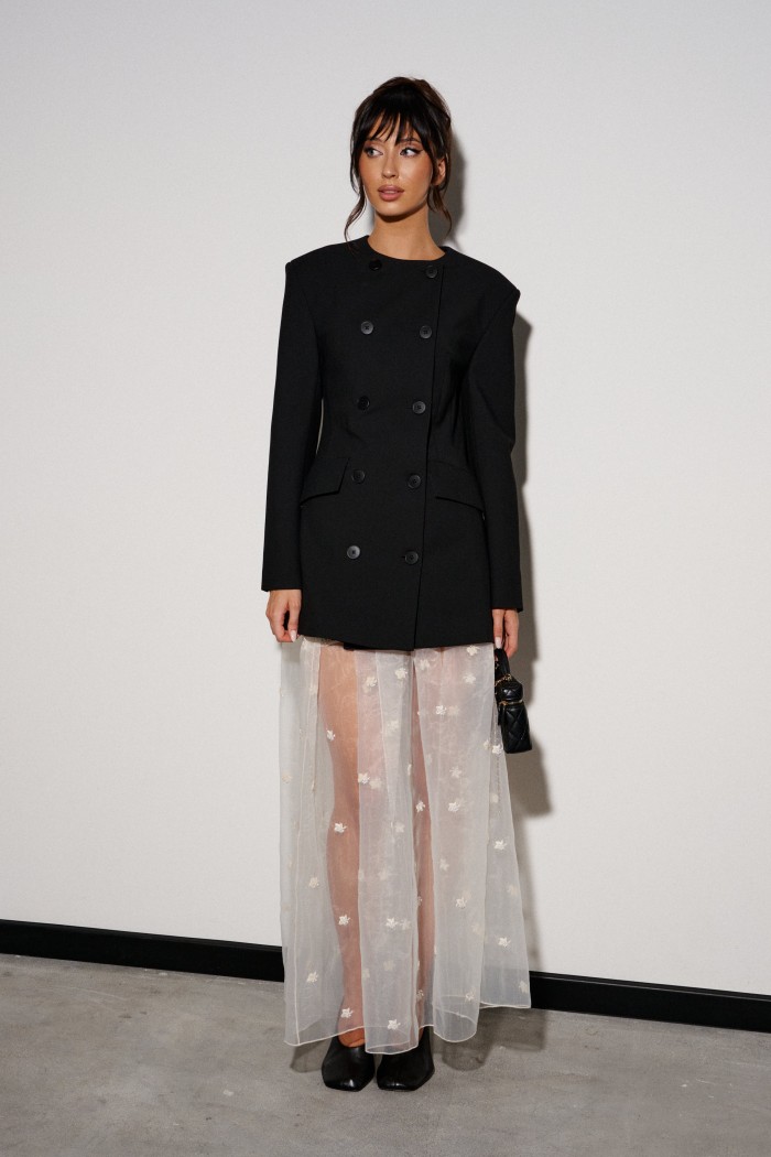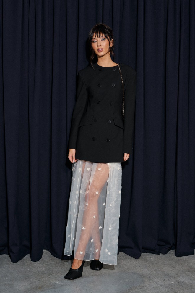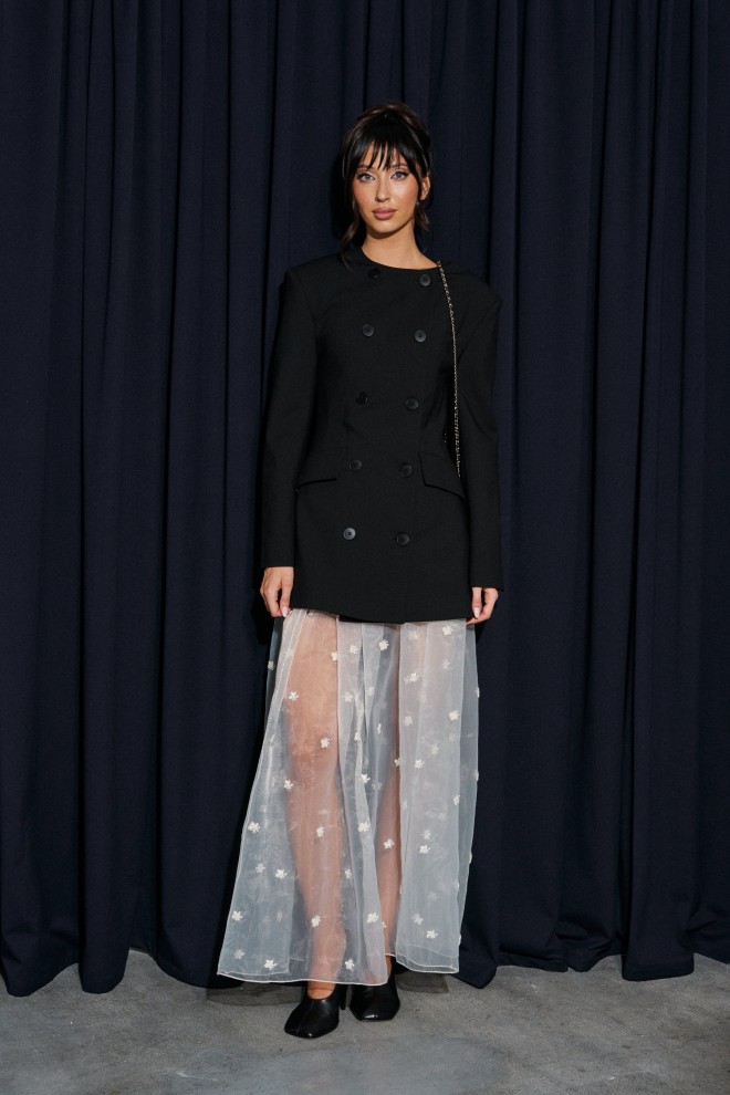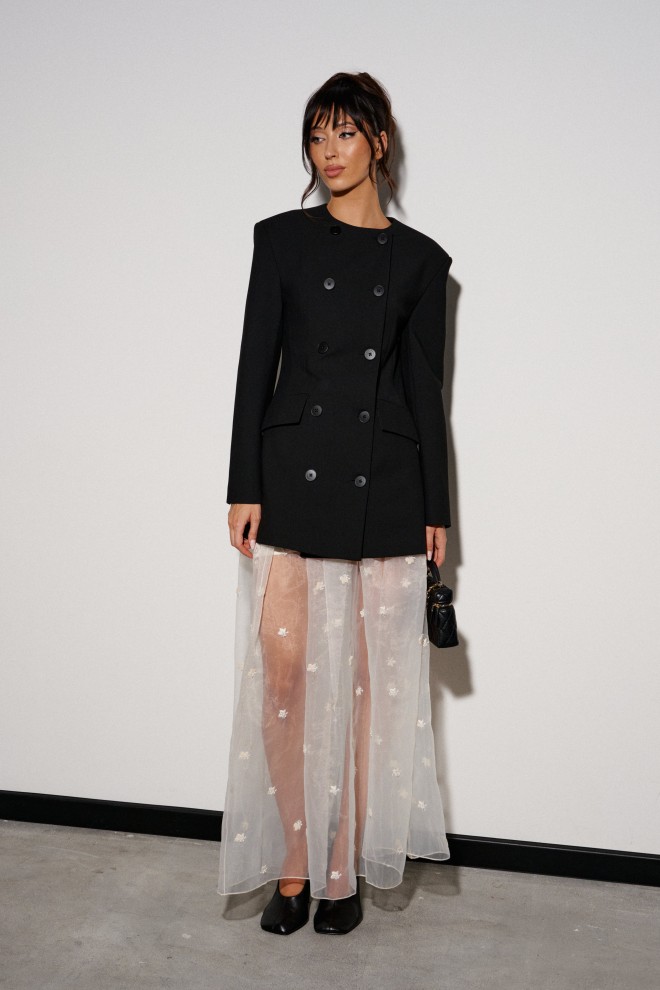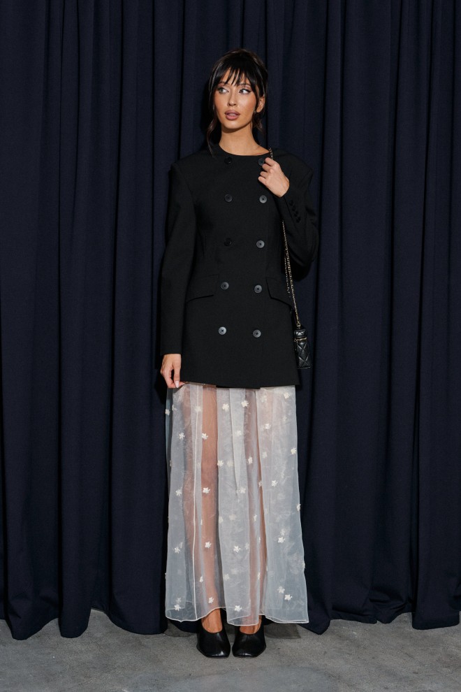 Юбка кроя полусолнце, выполнена из прозрачной ткани молочного оттенка с декоративной вышивкой.