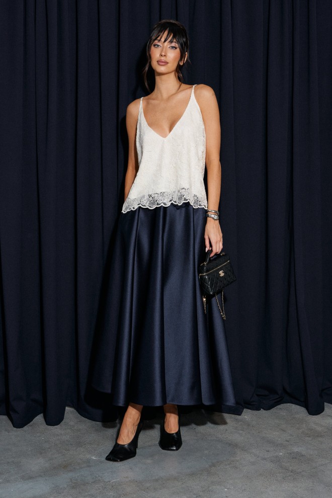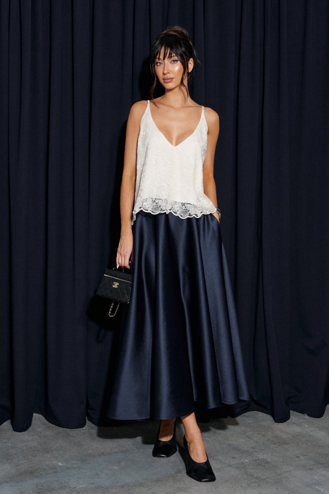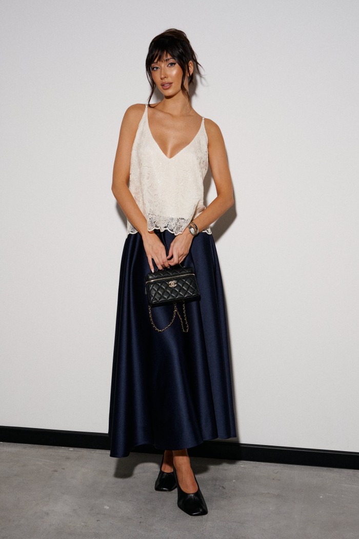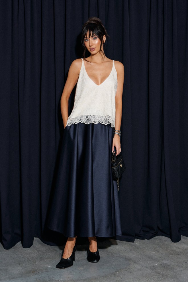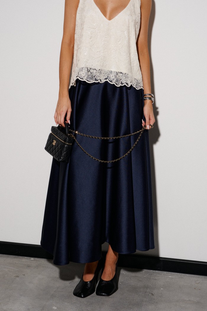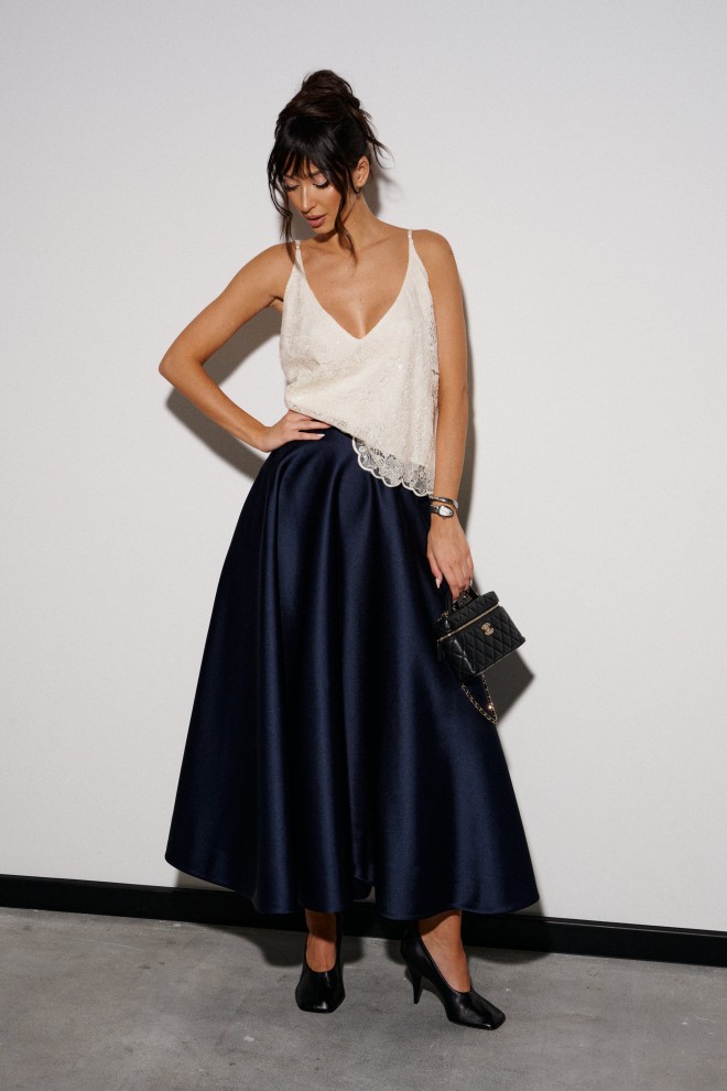 Юбка свободного кроя выполнена из плотного полотна темно - синего цвета.