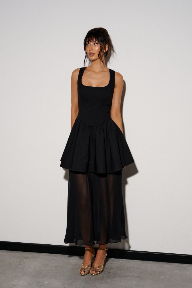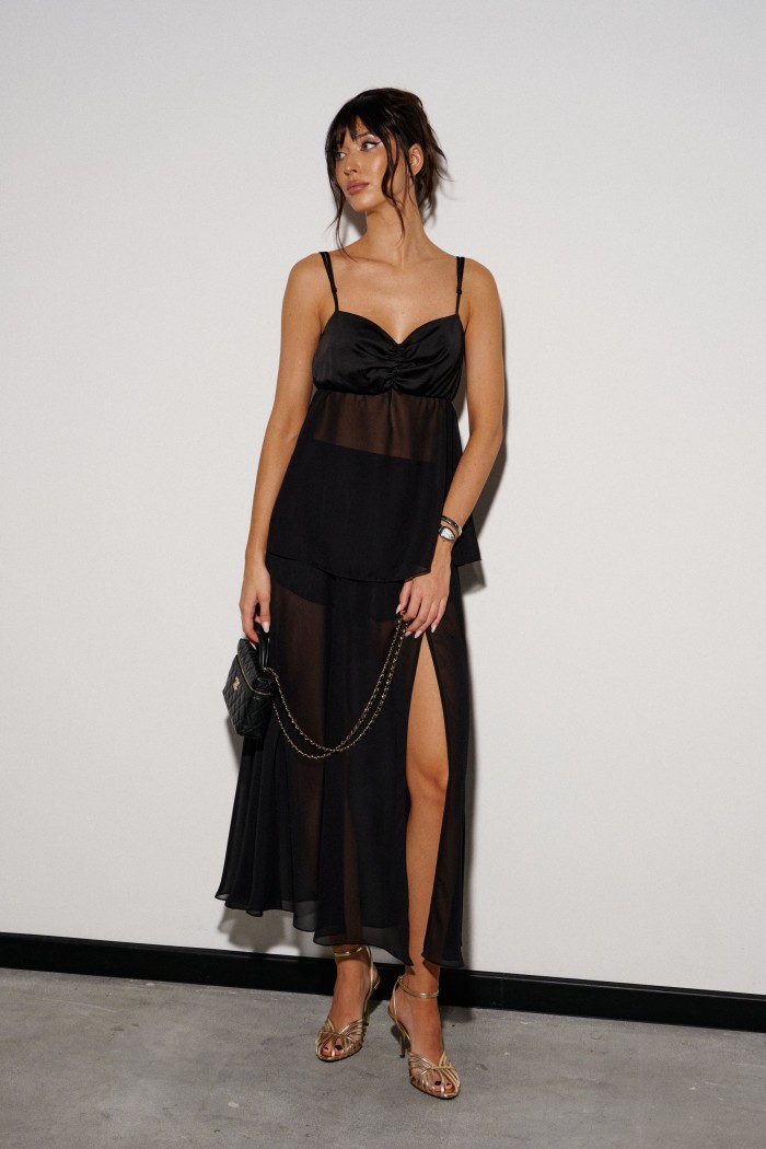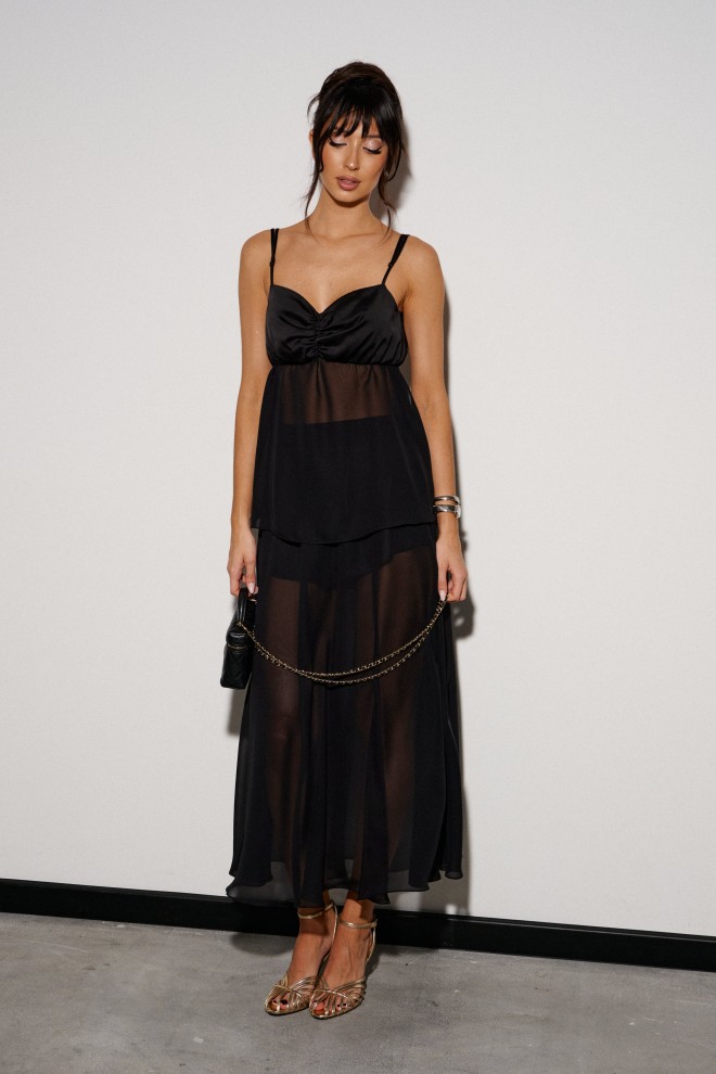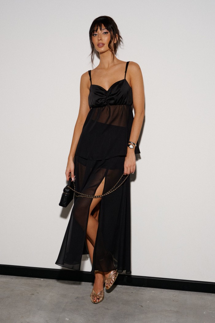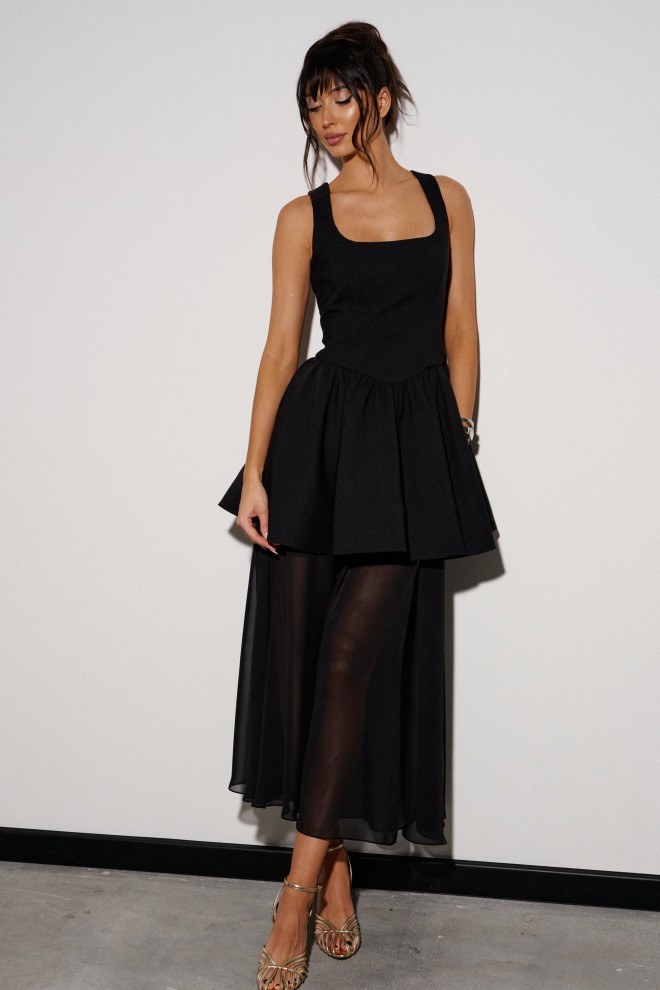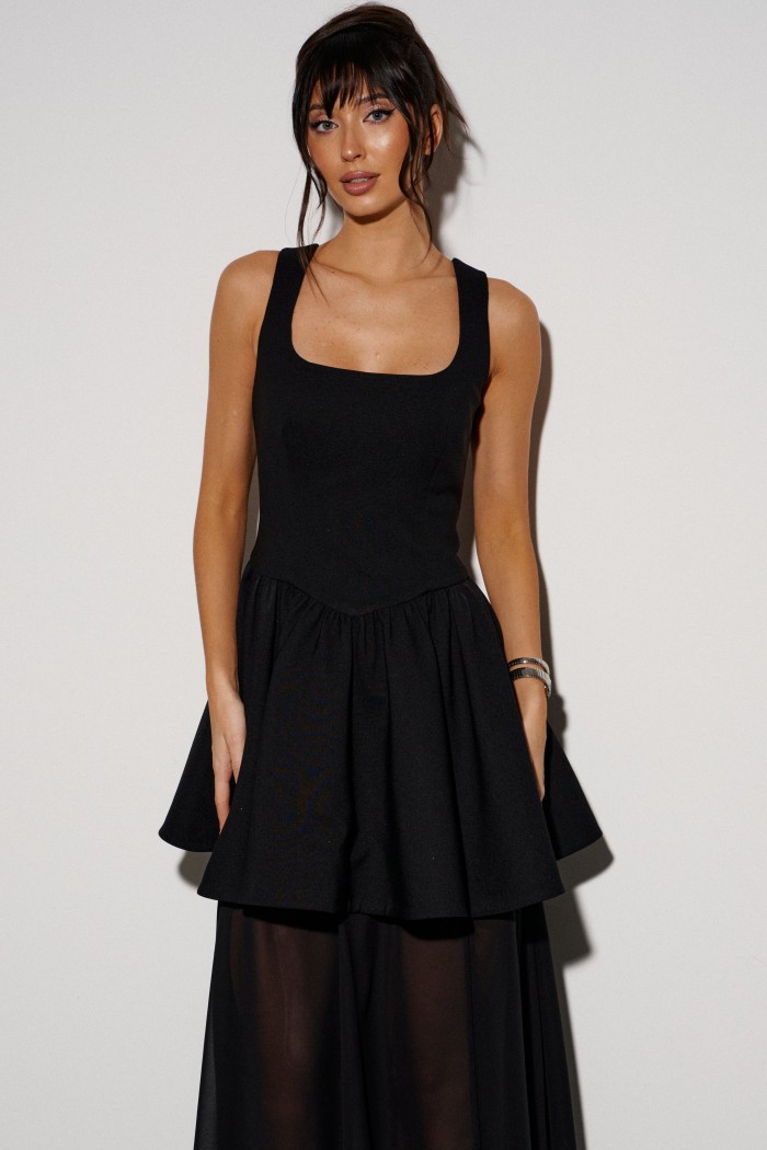 Юбка кроя полусолнце, выполнена из полотна черного цвета.