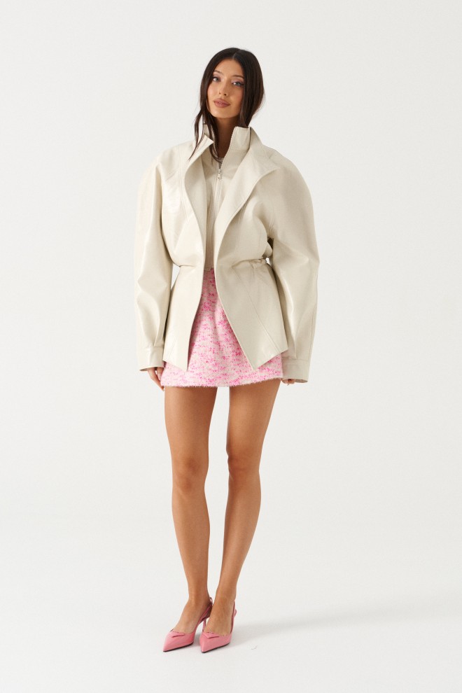 Юбка кроя-трапеция, выполнен из твидовой ткани бежево-розового цвета. Характеристика: крой трапеция, пояс на скрытой резинке, брендированный подклад, спереди изделия имитация карманов. Длина по боковому шву 36 см.