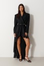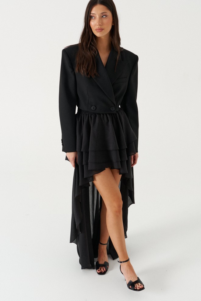 Юбка выполнена из легкого текстильного полотна черного цвета. Харакреристики: трехслойная юбка с фигурным низом, по переду слои юбки укороченные, по спинке нижний слой длинный, пояс юбки притачной, на резинке. Длина по переду 39см, длина сзади 120см.