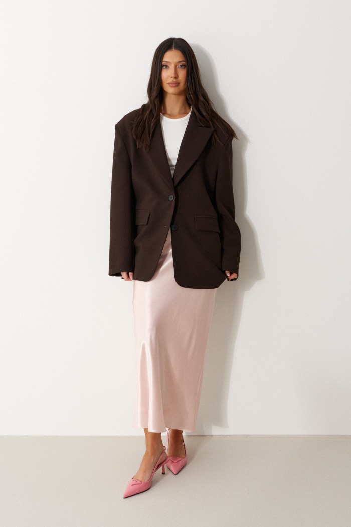 Юбка женская, длинная, покроена по косой. Выполнена из тонкого атласа в розовом оттенке. Характеристика: юбка на подкладке. Пояс цельнокроеный присборен на резинку. Низ обработан в подгибку с открытым срезом. Длина юбки 100 см.