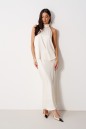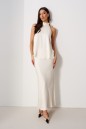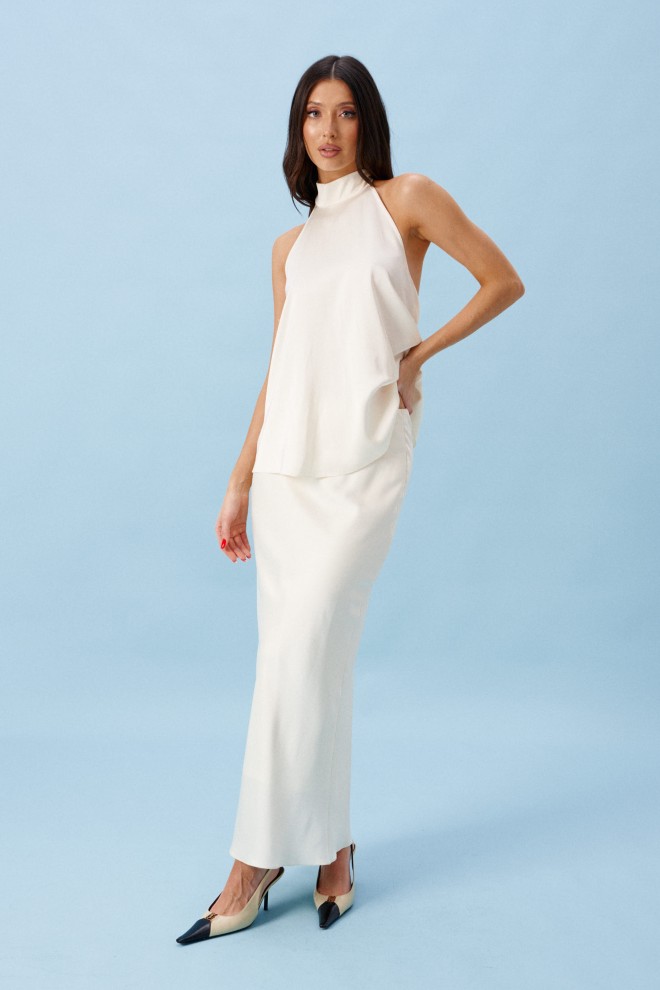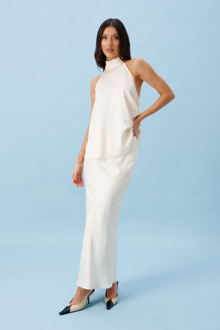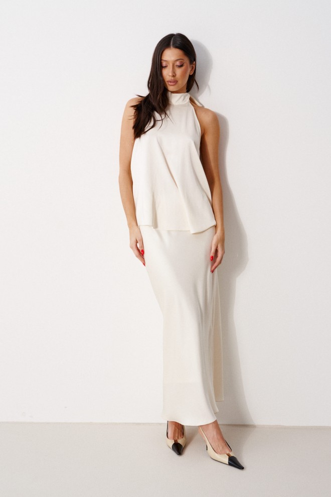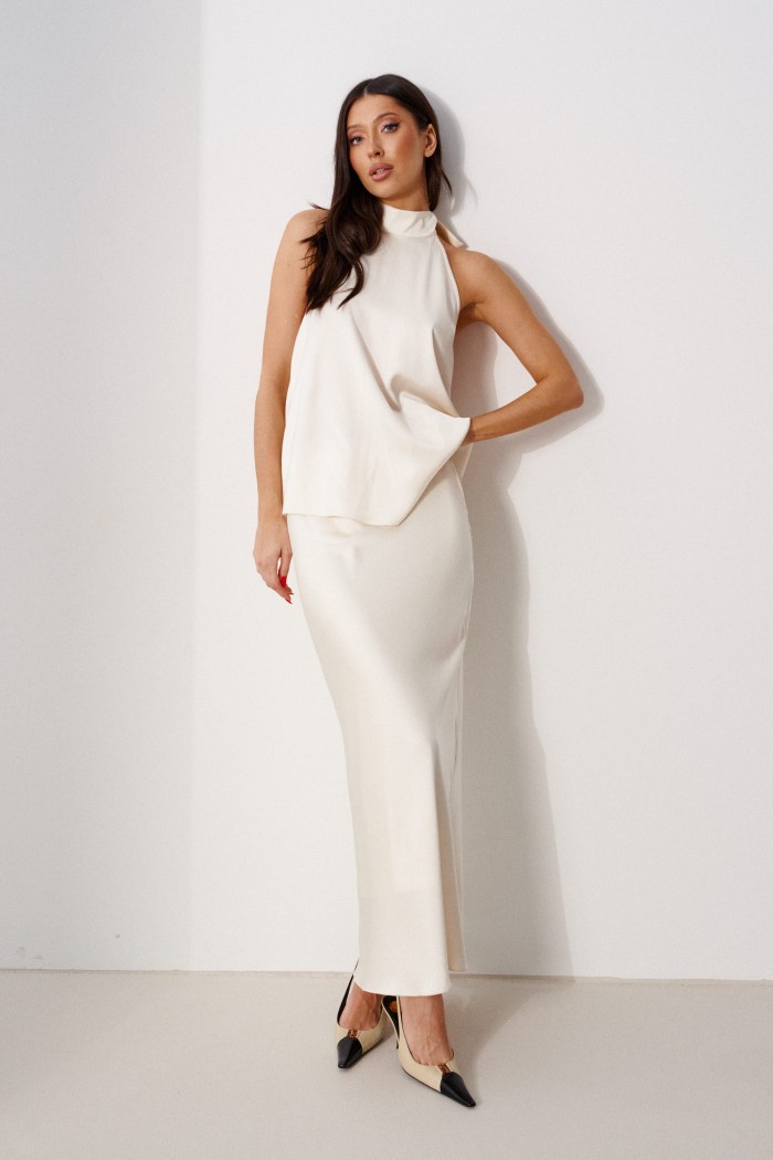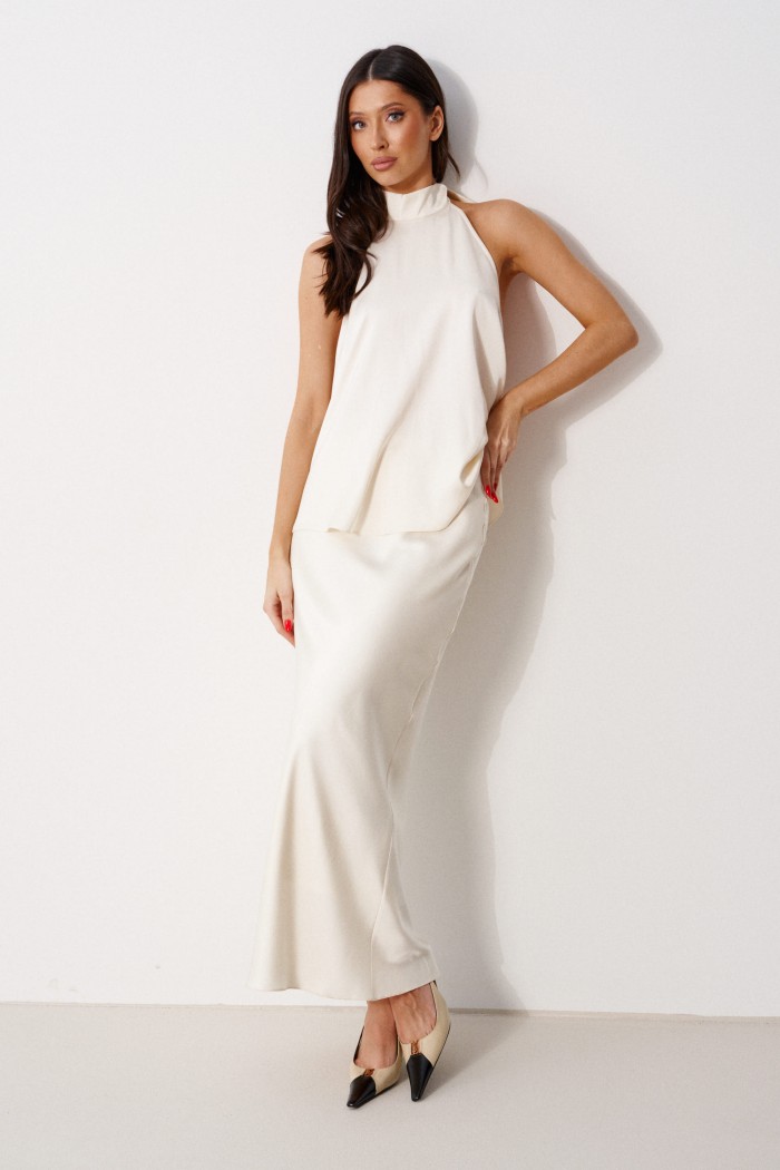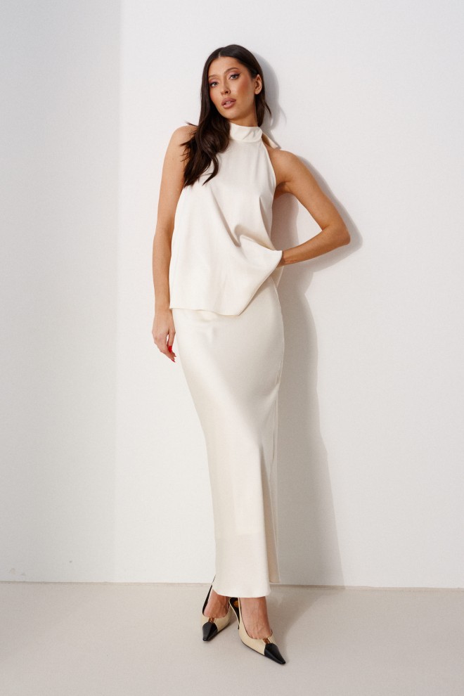 Юбка женская, длинная, выполнена из атласного полотна молочного цвета. Характеристика: юбка на подкладке, пояс присборен на резинку. Длина юбки 99 см.
