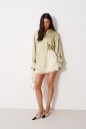 Юбка-мини полуприлегающего силуэта. Выполнена из прозрачной фактурной ткани молочного цвета. С подкладкой. Пояс на резинке. Застежки в изделии нет. Длина 41 см