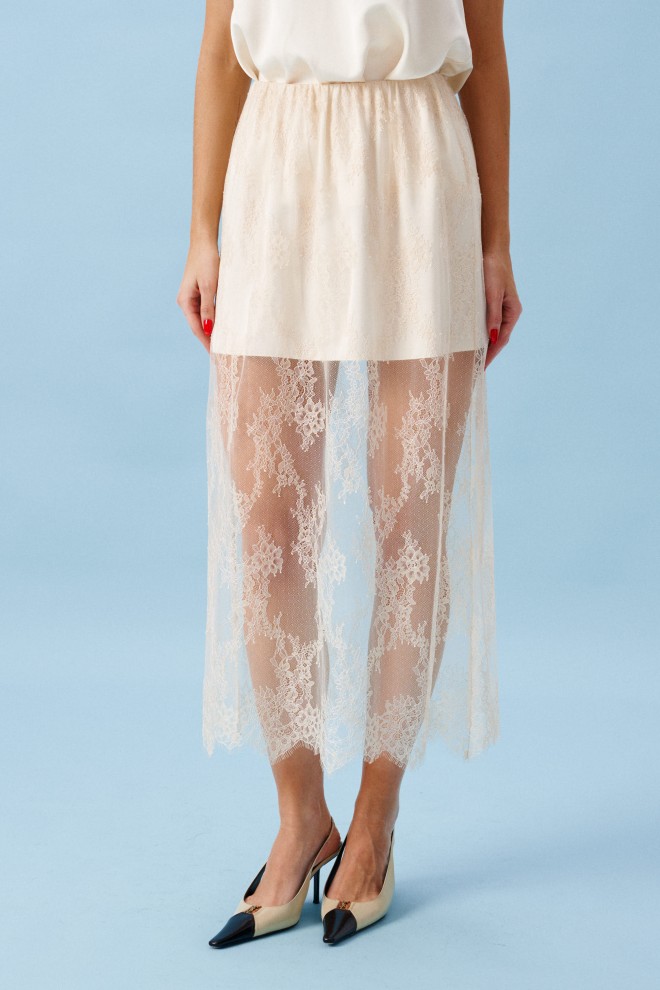 Юбка прямого кроя, выполнена из кружевного полотна бежевого цвета.
