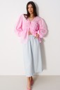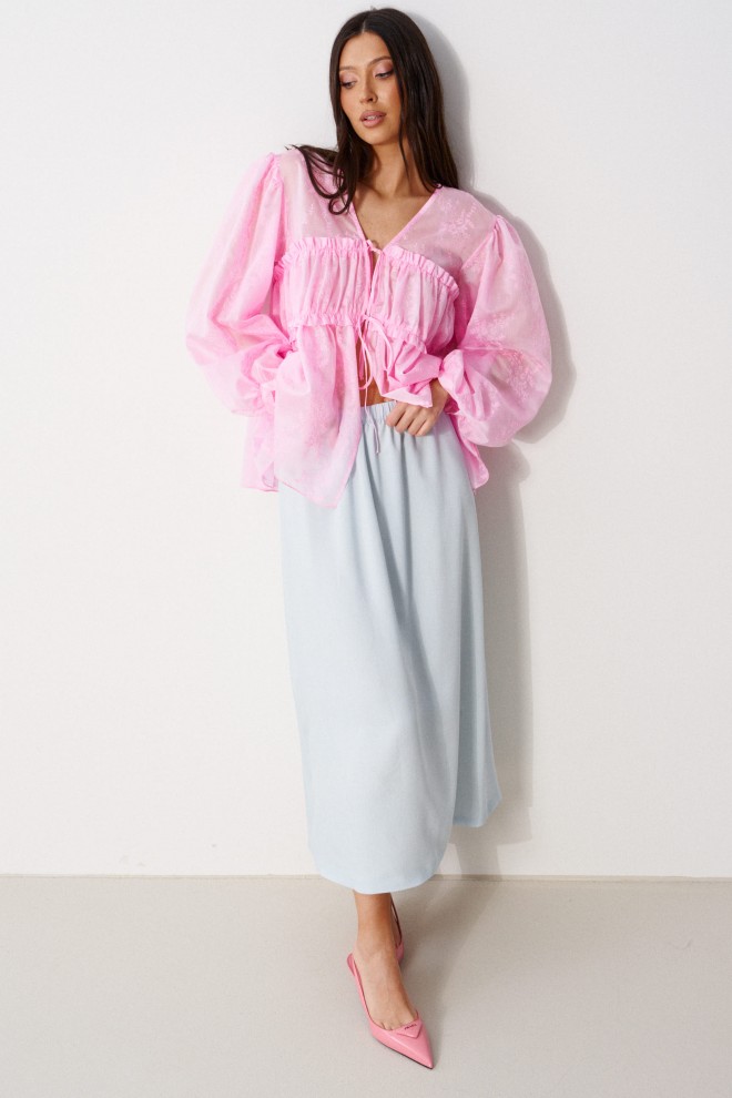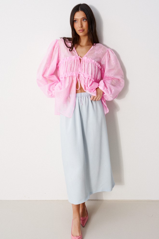 Юбка полуприлегающего силуэта выполнена из струящегося полотна голубого цвета на подкладке. Характеристики: полуприлегающий силуэт, пояс на резинке. Длина по боковому шву 86 см.