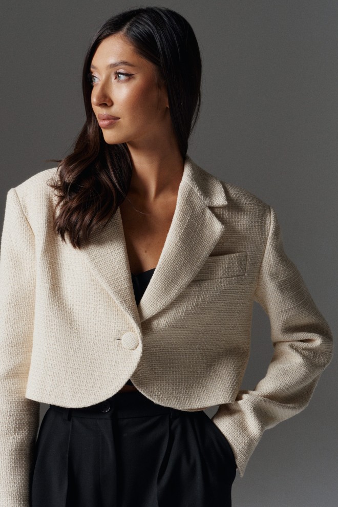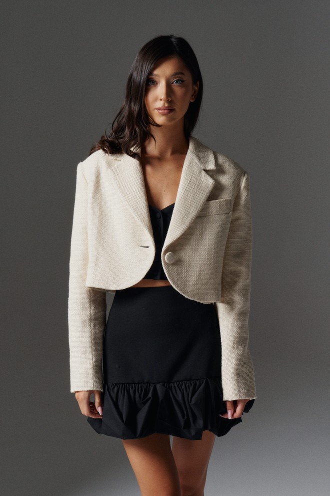 Укороченный жакет выполнен из фактурного полотна с вкраплением люрексовой нити.