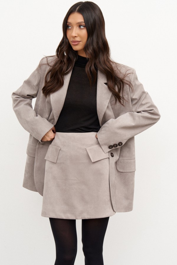 Жакет однобортный. Выполнен из эко-замши. Прямой крой, горизонтальный подрез ниже линии талии, подклад, разреза в спинке нет. Воротник с остроугольным лацканом. Застёжка контрастные петли-пуговицы. Карманы по переду внизу с клапаном без застёжки (функциональные), по груди карман-листочка (нефункциональный). Рукав втачной, на рукваве контрастные петли-пуговицы (нефункциональные), длина 65 см. Длина спинки 77 см