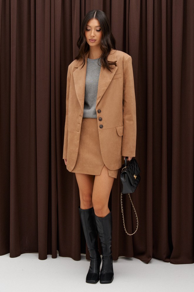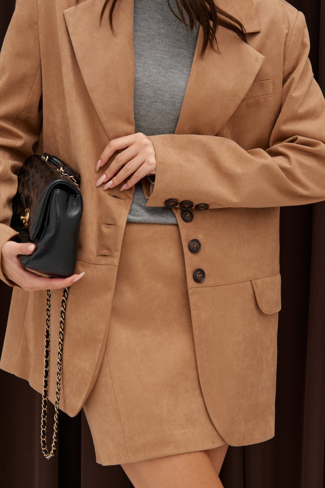 Жакет однобортный. Выполнен из эко-замши светло-коричневого цвета. Прямой крой, горизонтальный подрез ниже линии талии, подклад, разреза в спинке нет. Воротник с остроугольным лацканом. Застёжка контрастные петли-пуговицы. Карманы по переду внизу с клапаном без застёжки (функциональные), по груди карман-листочка (нефункциональный). Рукав втачной, на рукваве контрастные петли-пуговицы (нефункциональные), длина 65 см. Длина спинки жакета 77 см.