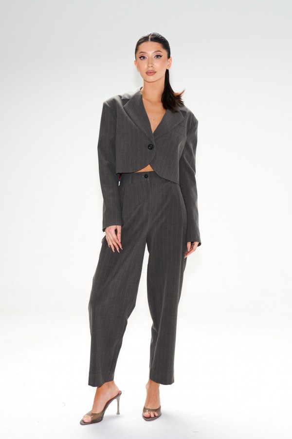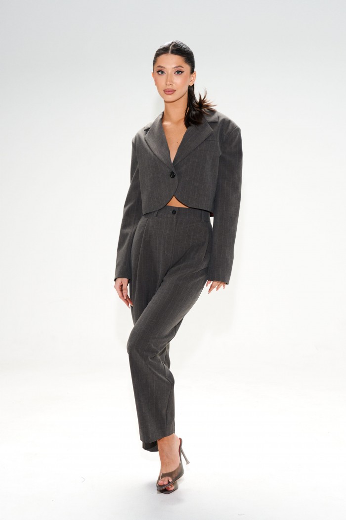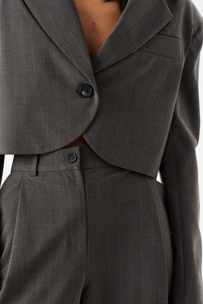Стильный укороченный жакет выполнен из ткани выполнен из костюмной ткани темно-серого цвета в тонкую полоску. Характеристики: укороченный, подкладка, подплечники, отложной воротник с остроугольным лацканом, застежка центральная - петля пуговица, низ изделия с плавным срезом, рукав втачной по низу рукава нашиты пуговички. Длина по спинке от края горловины 44, длина рукава от края горловины 78 см.