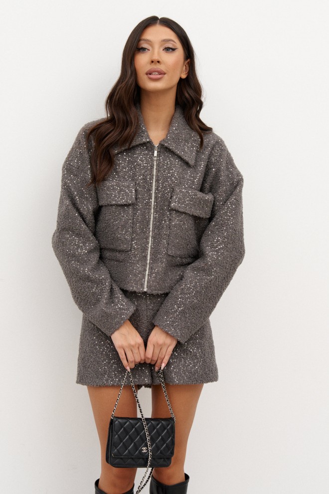 Жакет укороченный. Выполнен из трикотажного полотна букле с пайетками. Отложной воротник. Рукав спущенный. Застежка центральная молния. По переду накладные карманы с цельнокроенным клапаном. Есть подклад. Длина рукава от линии втачивания 51 см. Длина спинки 48 см