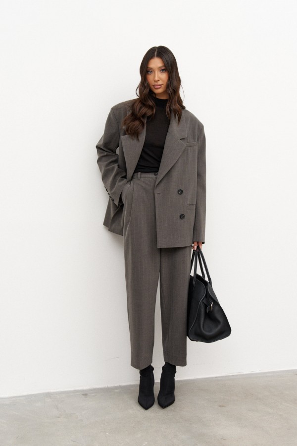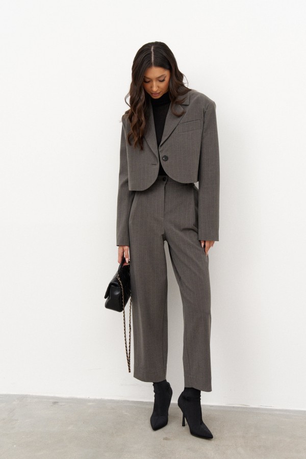 Жакет прямого кроя, выполнен из ткани серого цвета в тонкую полоску. Жакет двубортный, плечики, подклад, вортник с остроугольным лацканом, по преду изделия прорезные карманы (функциональные), застежка петли-пуговицы, рукав втачной, на рукаве декоративные пуговицы. Длина рукава от края горловины длина 81 см. Длина жакета по спинке от края горловины 72 см.