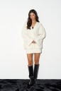 Кардиган выполнен из мягкого плотного трикотажа. Вырез горловины V-образный. Горловина и борты обработаны планкой. Застежка центральная на пуговички (декорированы тканью основного изделия). Рукав широкий, спущенный, с манжетой. Карманы накладные функциональные. Длина кардигана по спинке 66 см, длина рукава 52 см