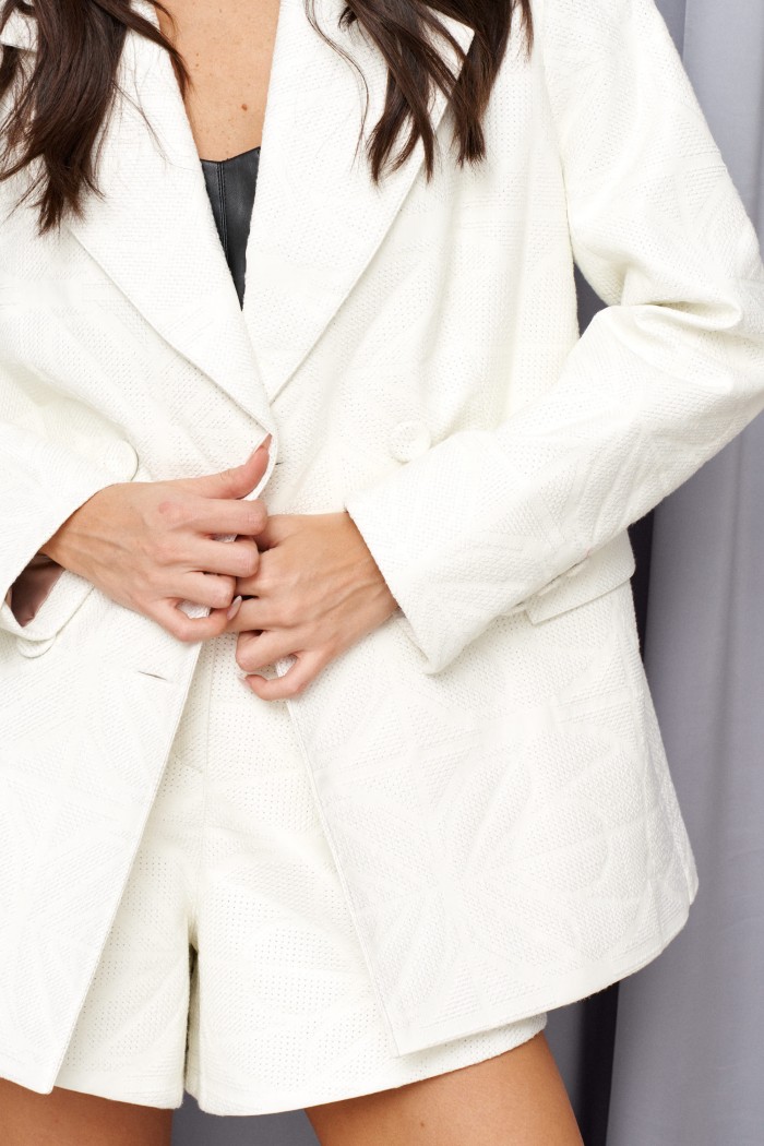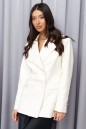 Жакет двубортный. Выполнен из фактурной эко-кожи белого цвета с вышивкой. Есть подклад. Приталенный силуэт. Воротник отложной с остроугольным лацканом. Рукав втачной, на рукаве петли-пуговицы (нефункциональные, декорированы эко-кожей в тон основной ткани). Есть подплечники. Карманы по переду внизу с клапаном. Застёжка петли-пуговицы. В среднем шве спинки шлица 18 см. Длина рукава 61 см. Длина спинки 69,5 см