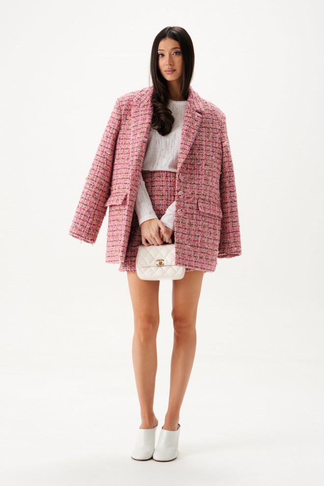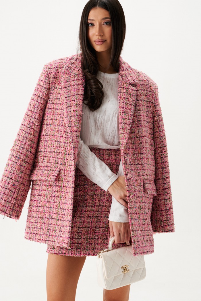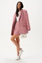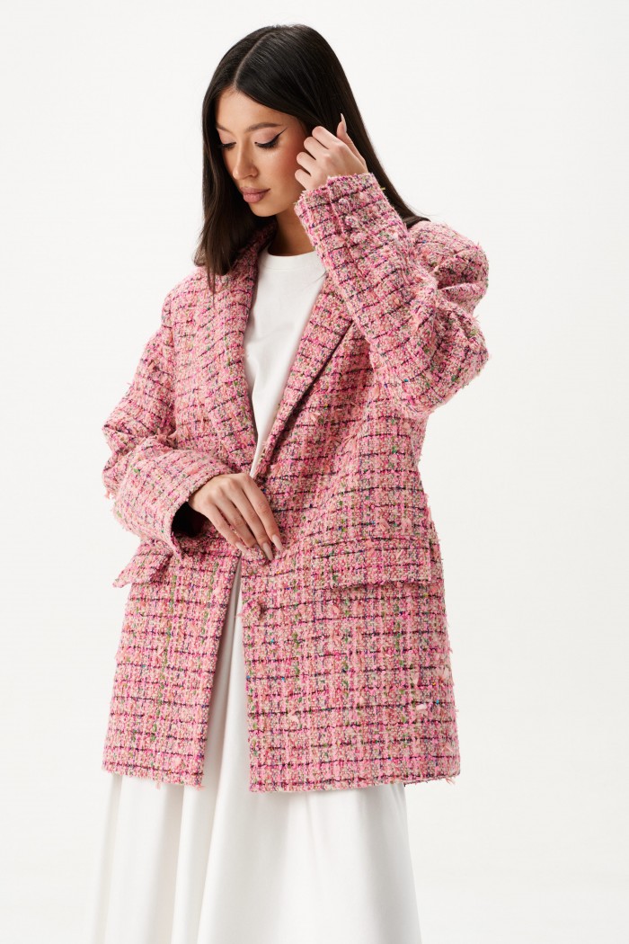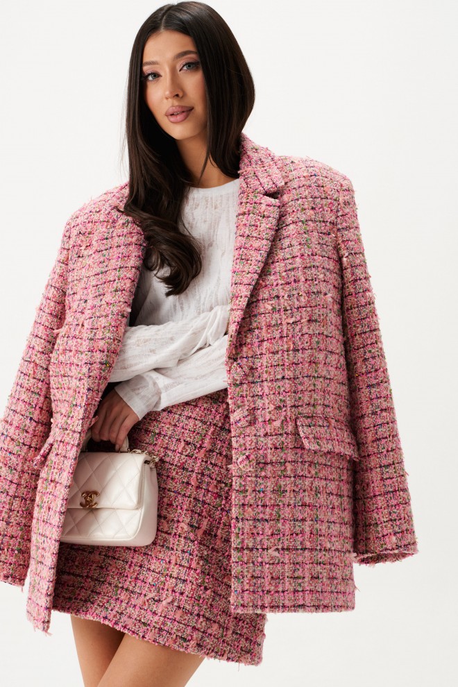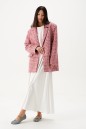 Жакет прямого свободного кроя выполнен из твидовой ткани розового цвета.