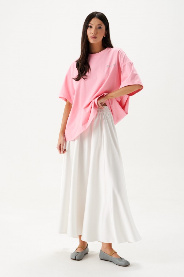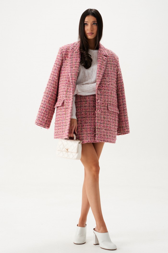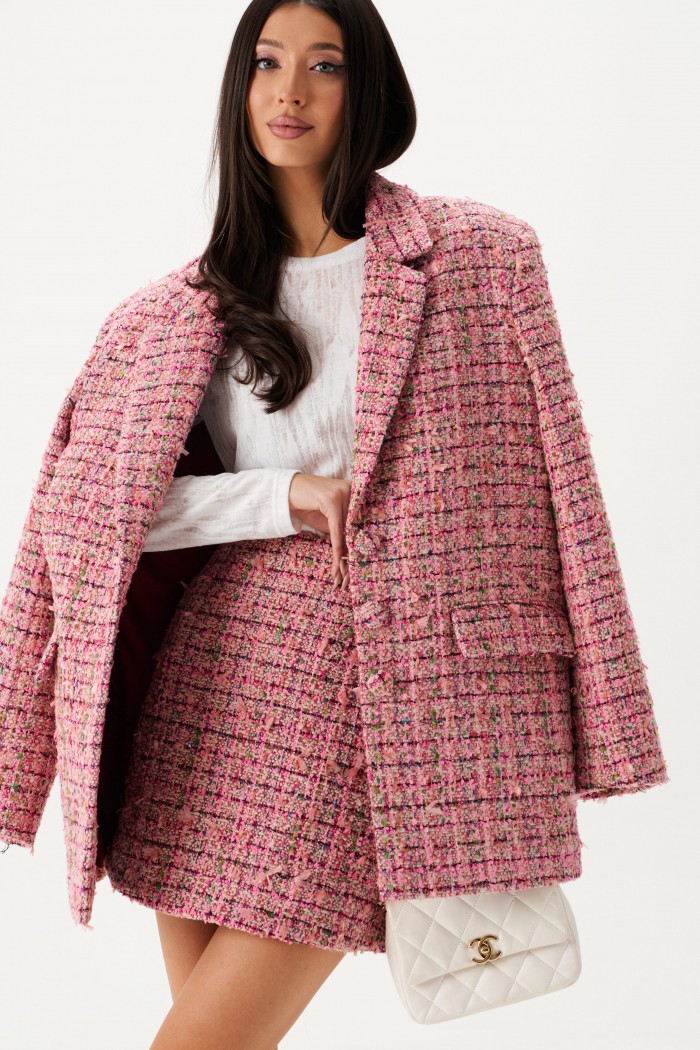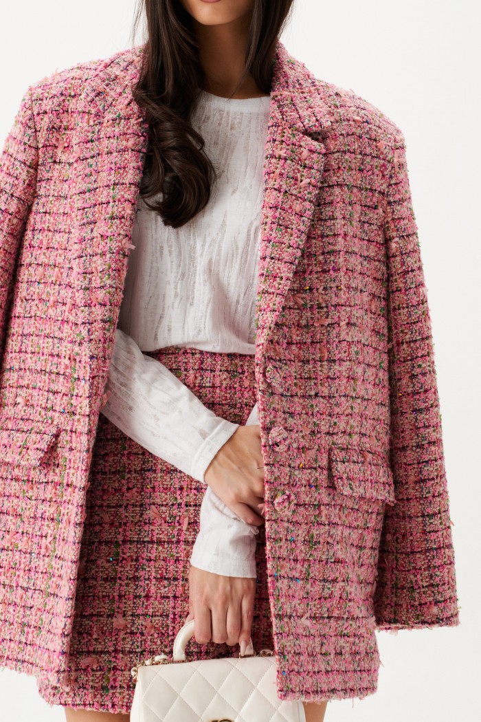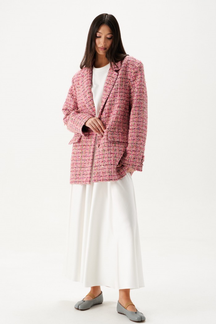 Жакет прямого свободного кроя выполнен из твидовой ткани розового цвета.
