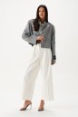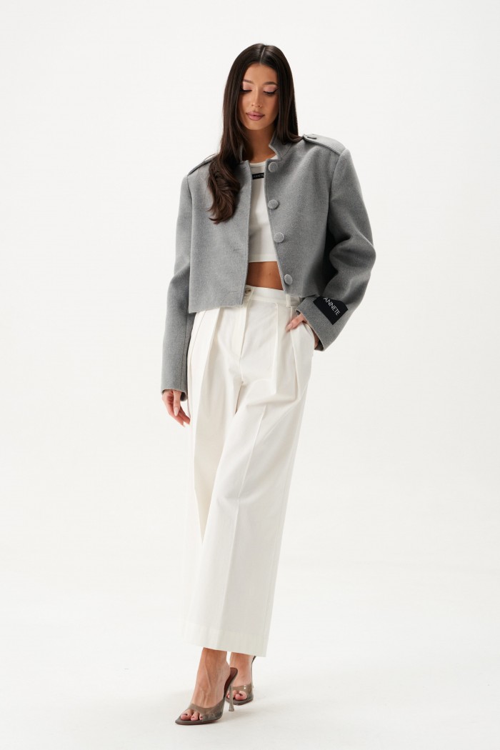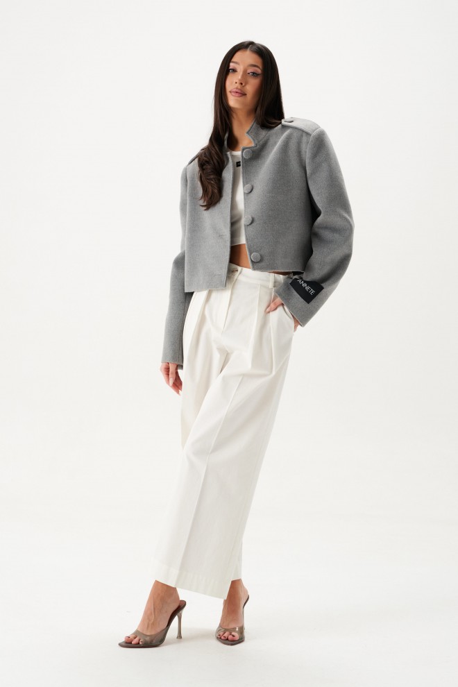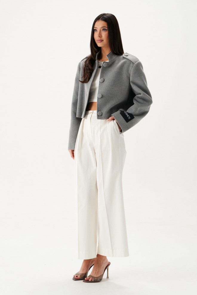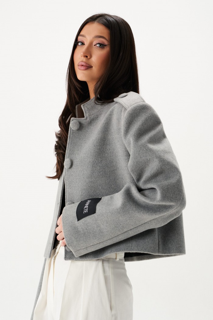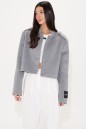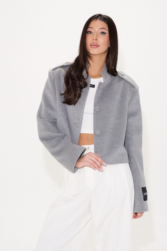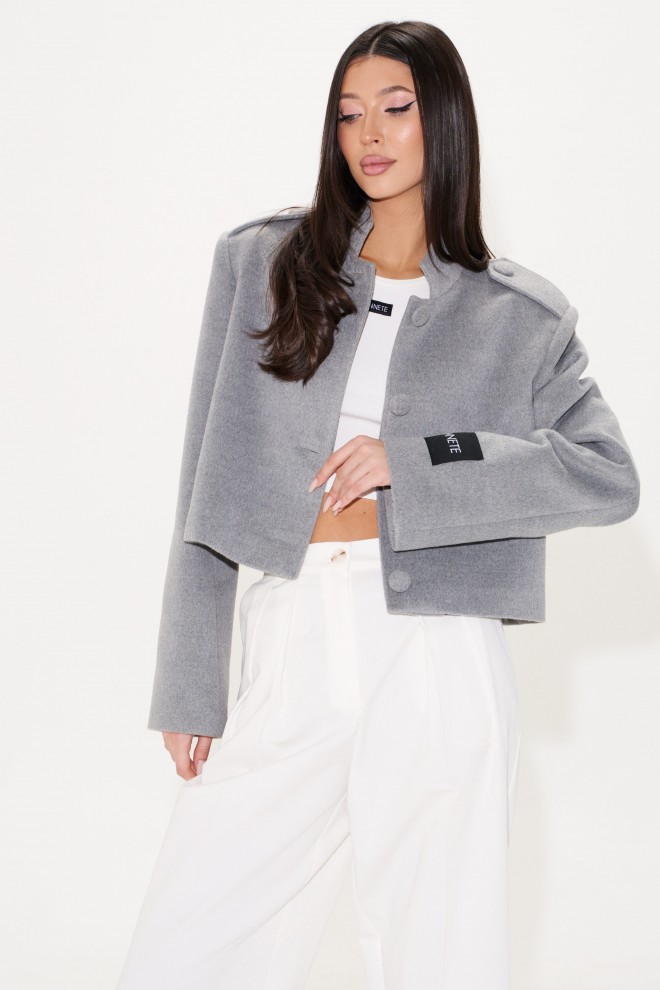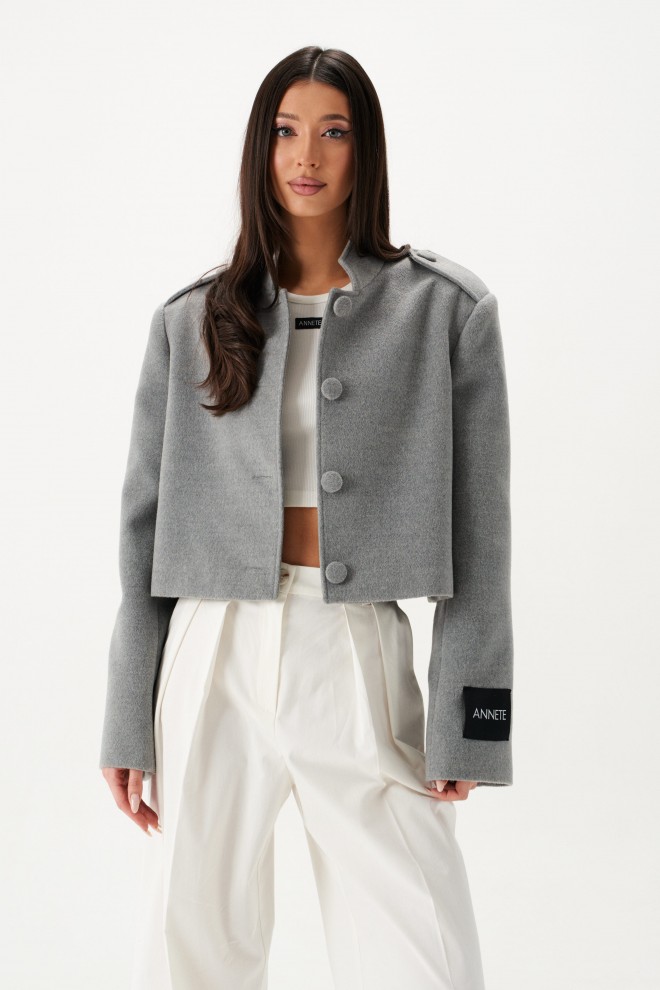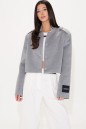 Жакет прямого свободного кроя, выполнен из ворсистой ткани серого цвета. Характеристики: горловина стойка, застежка центральнаяна петли пуговицы,рукав прямой, по плечевому шву пата на пуговице, на левом рукаве нашивка Annete. Длина по спинке 46 см, длина рукава 62 см.