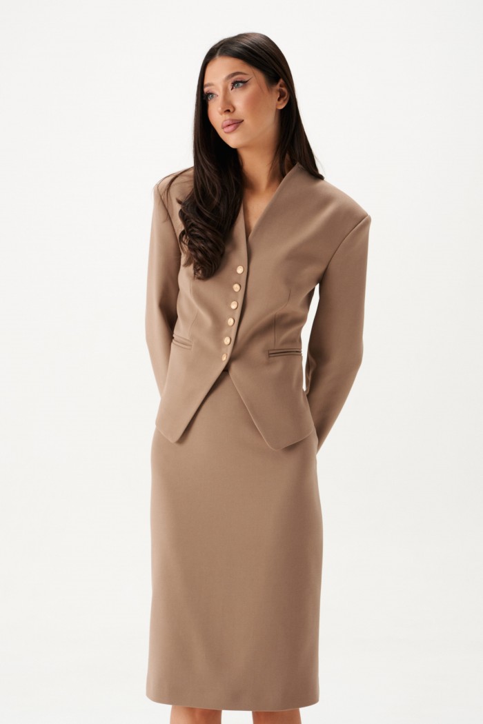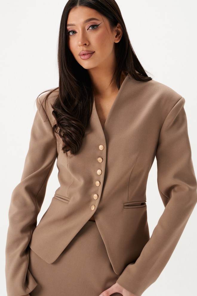 Жакет полуприлегающего силуэта выполнен из костюмной ткани в цвете капучино. Характеристики: полуприлегающий силуэт, подкладка и подплечники, V-образный вырез горловины, талиевые выточки по переду и спинке изделия. Застежка на петли пуговицы, рукав втачной, по переду прорезные карманы, борта жакета с плавным срезом. Длина изделия 52 см, длина рукава 59 см.