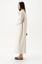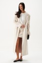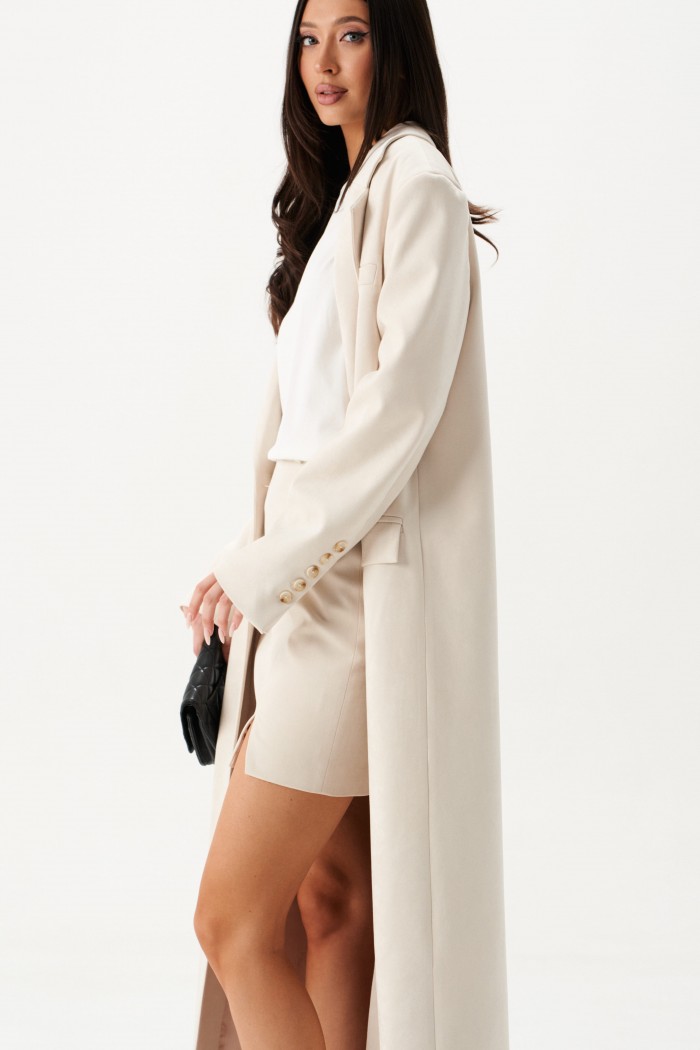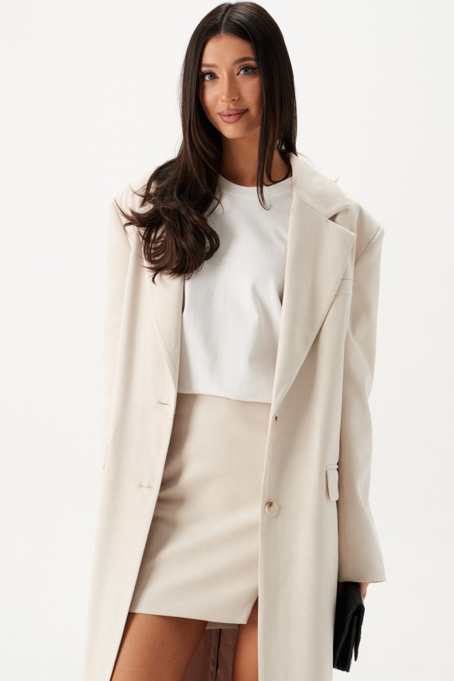 Жакет прямого свободного кроя, выполнен из имитации замши. Характеристики: прямой крой, подкладка, подплечники, отложной воротник, V образный вырез горловины, застежка центральная на две петли пуговицы, рукав втачной, по переду карманы с клапаном, в среднем шве заднего полотна изделия разрез 58 см. Длина изделия 131 см, длина рукава 64 см.