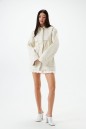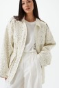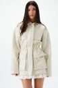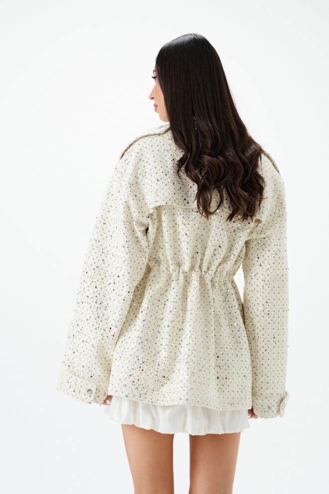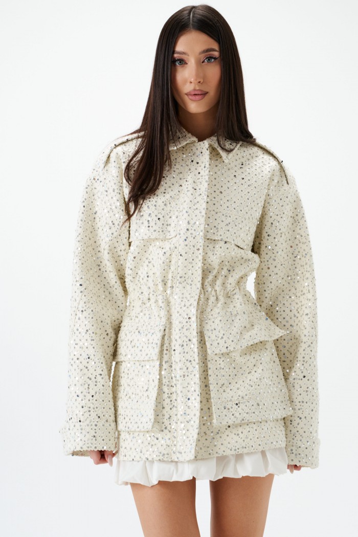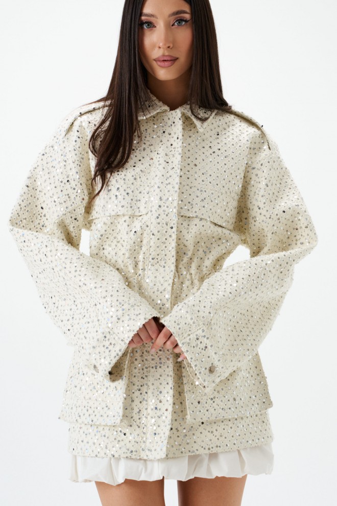 Жакет женский, приталенного силуэта, на подкладке, удлиненный молочного цвета с пайетками. Горловина круглая с отложным воротником.
