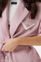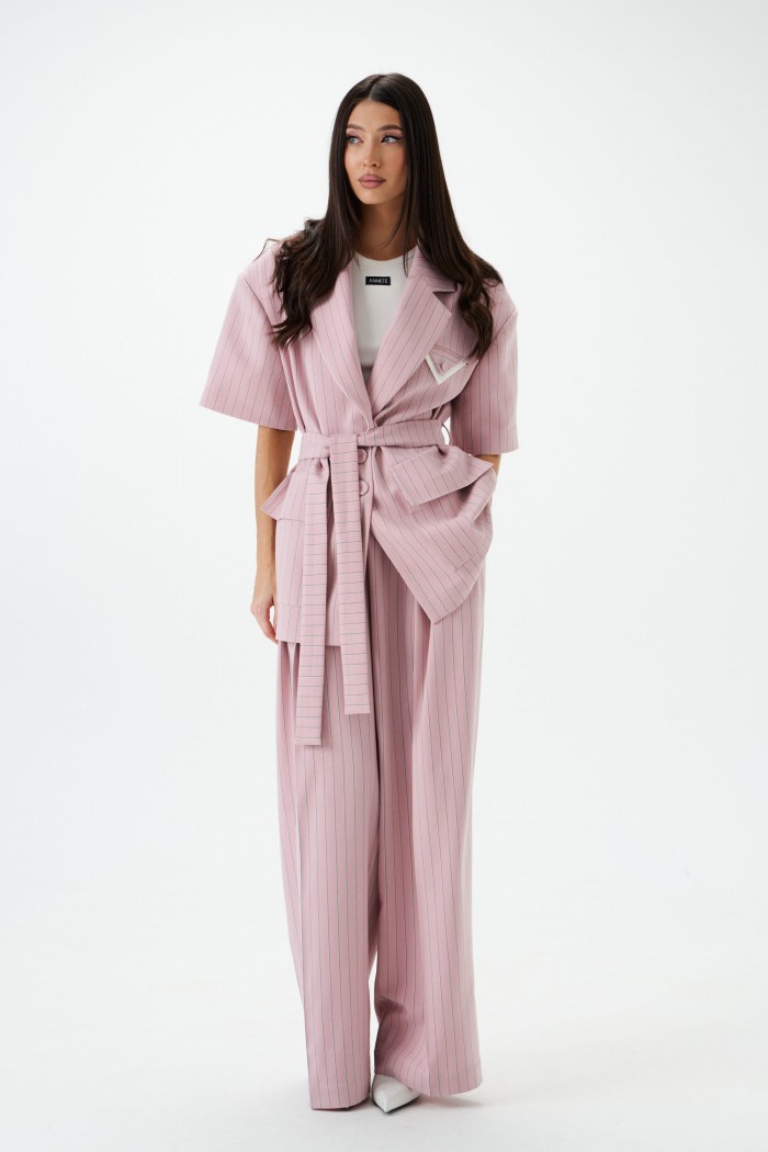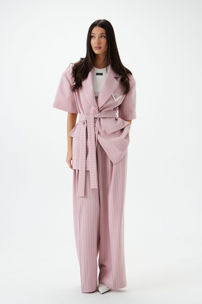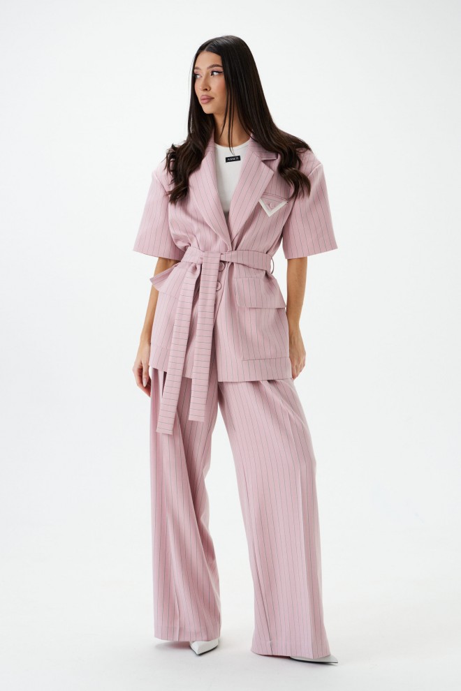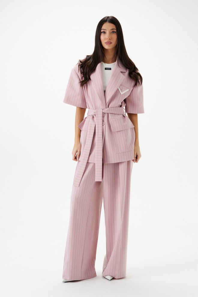 Жакет прямого кроя. Выполнен из костюмной ткани. Есть подкладка. Воротник пиджачного типа с лацканами. Рукав втачной, линия плеча расширена. Застёжка центральная на пуговицы. По переду накладные карманы с клапаном, нагрудный карман с декоративным платочком. Шлёвки, пояс из ткани основного изделия. Длина рукава от линии втачивания 23 см. Длина спинки 75 см