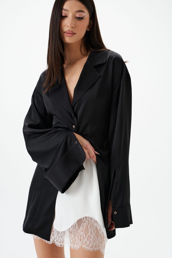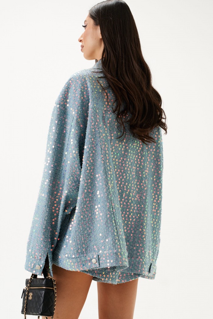 Жакет свободного кроя. Выполнен из джинсовой ткани голубого цвета на люрексной основе с перфорацией и пайетками. Воротник отложной. Рукав втачной, немного спущен. На рукаве манжета с кнопкой. Застежка центральная - кнопки. На уровне линии груди карманы с клапаном, внизу карманы с листочкой. Спинка отрезная. По низу изделия отрезная планка-пояс. На планке два хлястика с кнопками. Изделие без подкладки. Длина спинки 71 см. Длина рукава от линии втачивания 60 см