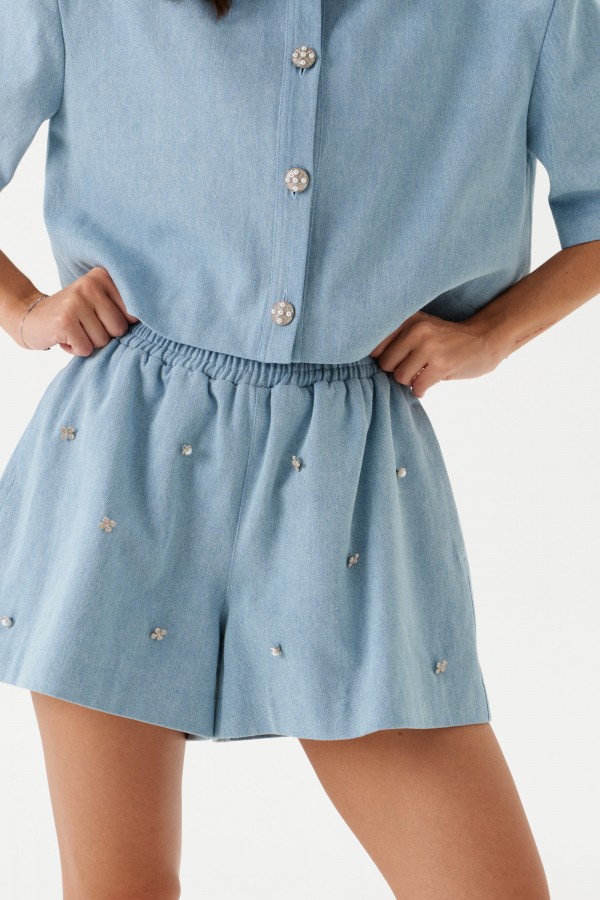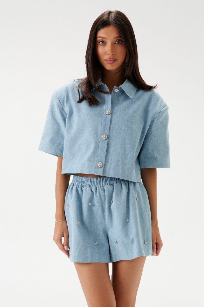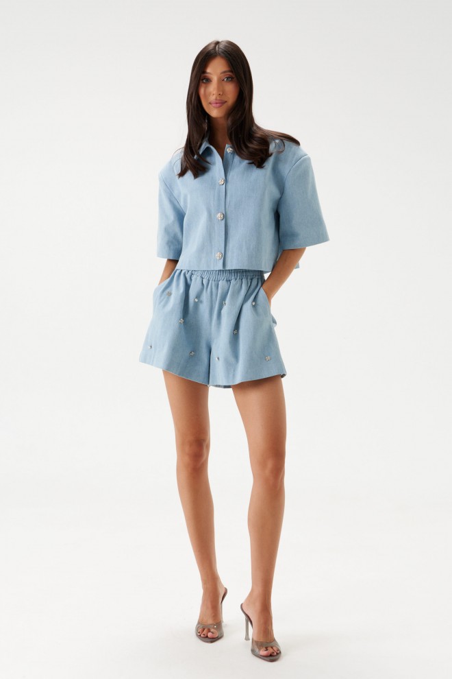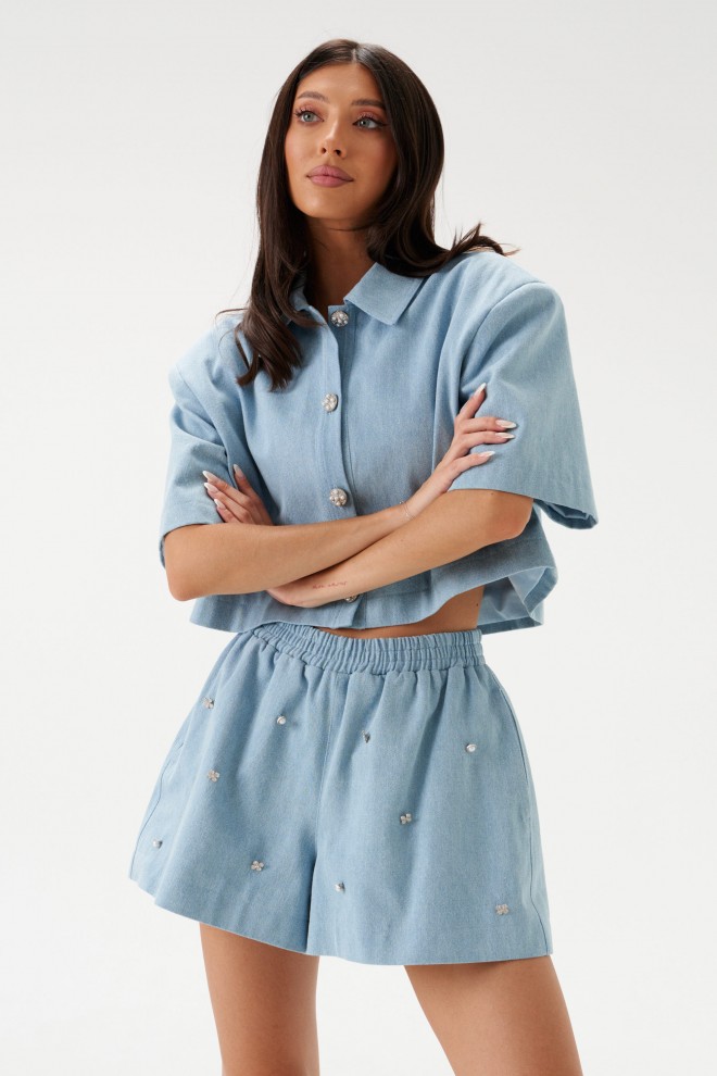 Укороченный жакет, прямого кроя, выполнен из джинсовой ткани. Воротник отложной, по центру застежка на петли - пуговицы, спинка цельная, рукав втачной, одношовный, подплечники.Длина по спинке 45см, длина рукава 27см