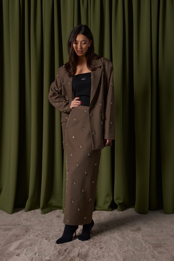 Жакет прямого свободного кроя выполнен из костюмной ткани цвета хаки с декоративной вышивкой.