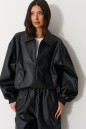 Бомбер выполнен из экокожи с теснением черного цвета цвета. Характеристики: отложной воротник, застёжка на молнии, на брендированной подкладке, по переду изделия крупные накладные карманы с клапаном, спущеный рукав заканчивается манжетом-резинкой,по низу изделия резинка. Длина по спинке 54 см, длина рукава от горловины 81 см.