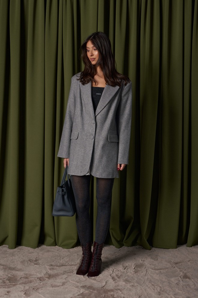 Жакет прямого свободного кроя. Выполнен из шерстяной (смесовой) ткани серого цвета. Характеристика: подкладка, воротник отложной с лацканами, рукав втачной и чуть спущен, по переду карманы с клапанами, застёжка центральная - пуговицы, в среднем шве заднего полотна шлица (29,5 см). В комплекте пояс из ткани основного изделия. Длина спинки 78 см. Длина рукава от линии втачивания 62 см