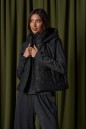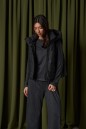 Жилет укороченный, выполнен из стеганной трикотажной ткани графитового цвета. Характеристика: жилет А-силуэта, вортник стойка, капюшон цельный с жилетом, центральная застежка на молнию, скрывается под планкой на кнопках, боковые карманы на молнии, по низу изделия резинка с фиксаторами, брендированный подклад, спинка цельнокройная. Длина изделия от края горловины по спинке 58см.