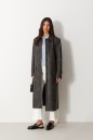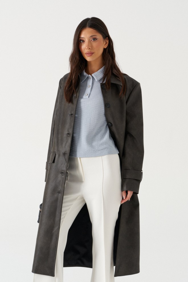 Удлиненный плащ прямого свободного кроя, выполнен из экокожи. Характеристики: отложной воротник, застежка центральная на петли - пуговицы. Брендированная подкладка, подплечники. Рукав втачной, по низу рукава пата с пуговицей. В комплекте идет пояс из основной ткани изделия. По переду карманы с клапаном. В среднем шве спинки шлица 44см. Длина изделия 117 см, длина рукава от края горловины 79.5 см.