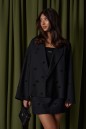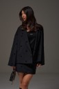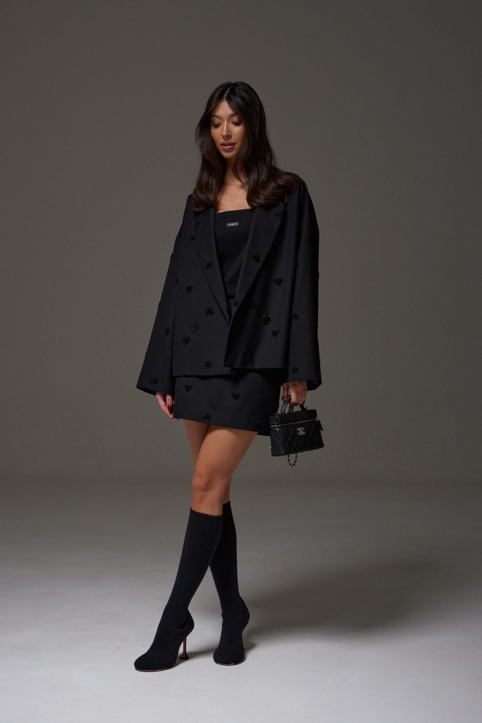 Жакет прямого кроя, выполнен из костюмной ткани черного цвета с шитем в форме сердец. Характеристика: Жакет двубортный, подклад, воротник с остроугольным лацканом, в боковых швах изделия карманы, рукав спущеный, прямой. Длина рукава от края горловины 74см. Длина жакета по центру спинки от края горловины 63 см