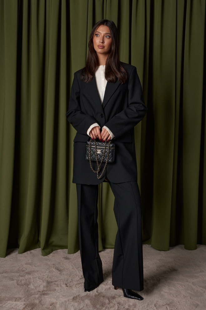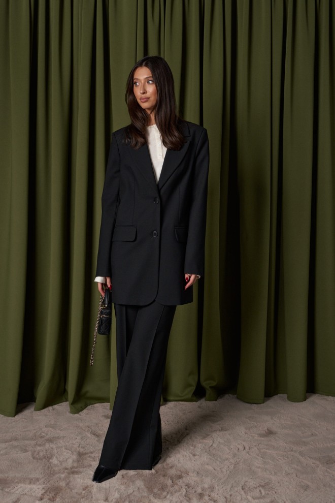 Жакет прямого свободного кроя. Выполнен из костюмной ткани чёрного цвета. С подкладкой. Воротник отложной, с лацканами. Рукав втачной. Есть подплечники. По переду карманы с клапанами. Застёжка центральная - пуговицы. Разреза и шлицы в жакете нет. Длина рукава от линии втачивания 65 см. Длина спинки 82,5 см