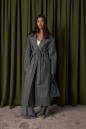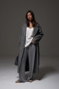 Полупальто прямого кроя, выполнено из шерстяной (смесовой) ткани серого цвета с пайетками. Характеристики: на брендированной подкладке, рукав втачной, к низу заужен, воротник пиджачного типа, в боковых швах карманы. Спинка со средним швом заканчивается шлицей, застёжка центральная на петли и пуговицы, пояс выполнен из основной ткани изделия.
