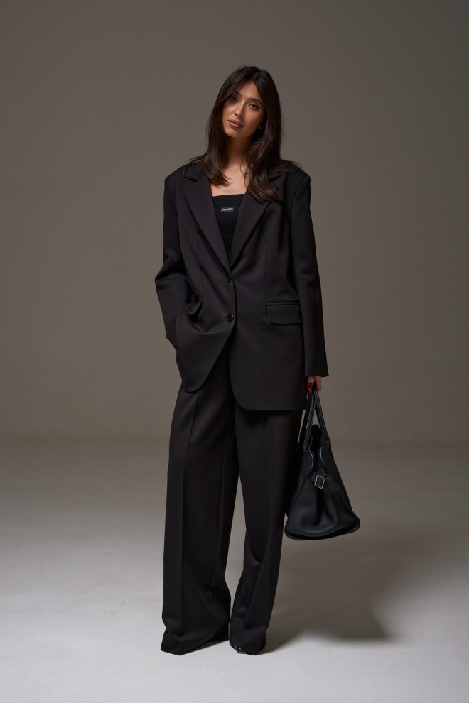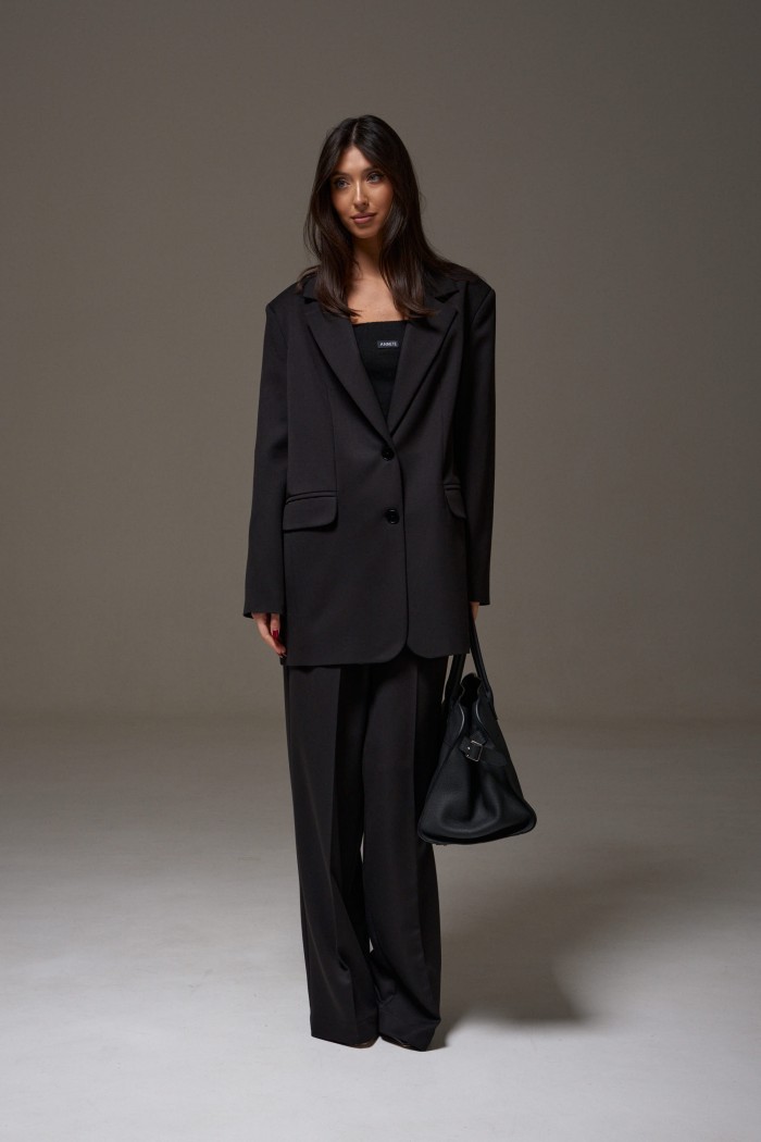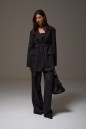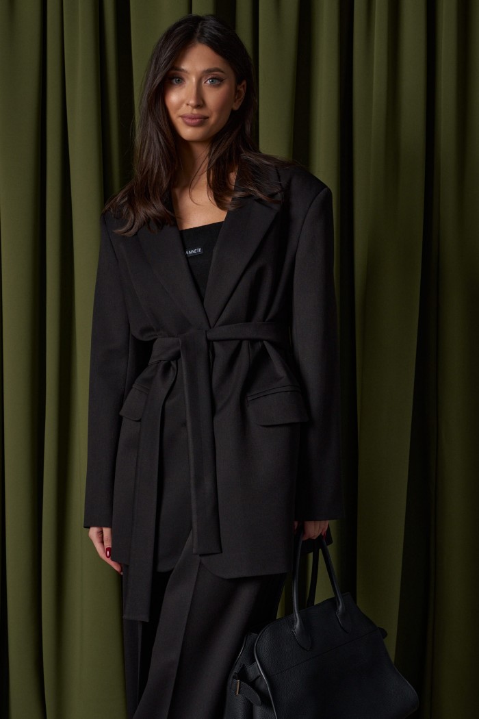 Жакет однобортный прямого свободного кроя, выполнен из текстильного полотна черного цвета. Характеристики: брендированная подкладка, подплечники, воротник с остроугольным лацканом, застежка центральная на петли пуговицы, по переду карманы с клапаном, рукав втачной, спинка со средним швом, по низу изделия лацкан 29см, в комплекте пояс из ткани основного изделия. Длина жакета по спинке 78 см, длина рукав 64см.