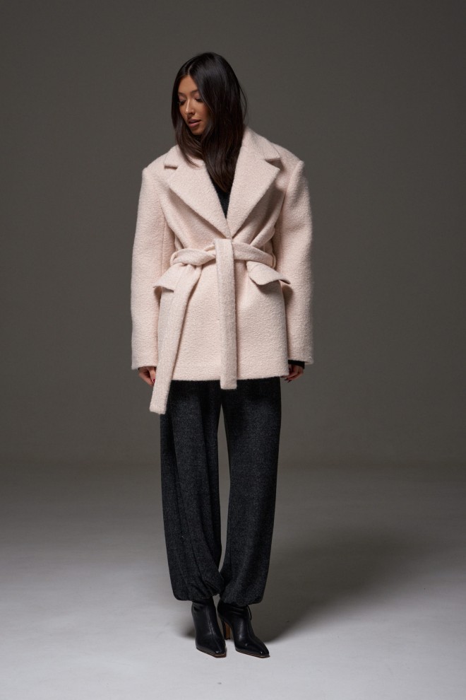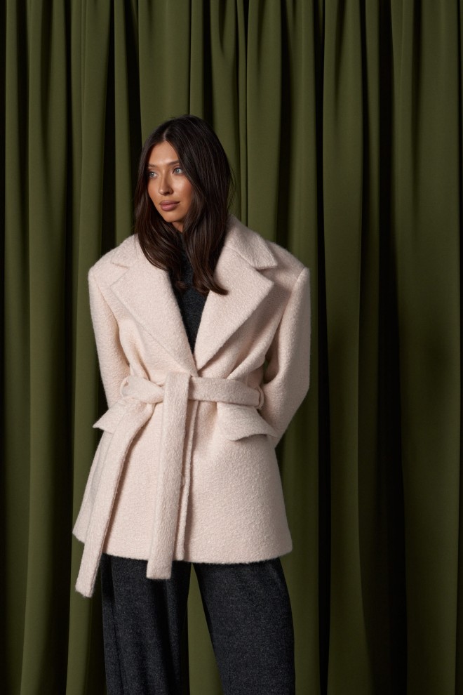 Полупальто однобортное прямого кроя, выполнено из полотна бежевого цвета ворсистой текстуры. Характеристики: прямой крой, брендированная подкладка, воротник с остроугольным лацканом, застежка центральная на петли - пуговицы, по линии талии шлевки, в комплекте пояс из ткани основного изделия, по переду функциональные карманы, рукав втачной, спинка цельнокройная. Длина по спинке 78 см, длина рукава 60 см.