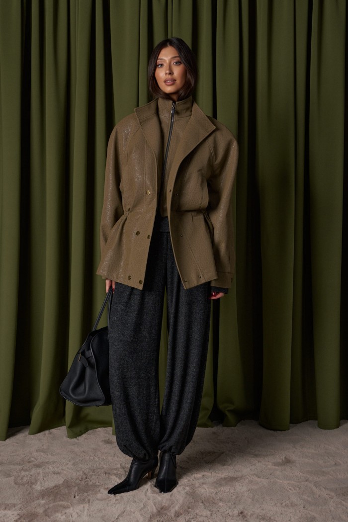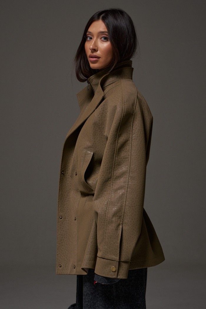 Куртка с акцентной талией, выполнен из эко-кожи цвета хаки. С подкладкой, с утеплителем (утеплитель по переду и по спинке). Характеристика: прямой свободный крой. Пояс изделия на резинке с фиксатором во внутренней части. Брендированная подкладка. Горловина стойка, манишка из основной части изделия на молнии. Застежка центральная двубортная на шесть кнопок. Функциональные карманы в части груди. Рукав реглан, центральная часть прошита планкой, низ рукава фиксируется кнопкой. Длина по спинке 72.5 см, длина рукава от края горловины 80см.