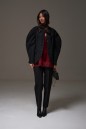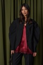Жакет прилегающего силуэта. Выполнен из костюмный ткани черного цвета. С подкладкой. Воротник-стойка. Вырез горловины V-образный. Рукав втачной, объёмный, заужен к низу. По переду карманы с клапаном. Застёжка центральная - пуговицы. Низ жакета фигурный. Длина спинки 69 см. Длина рукава от линии втачивания 63 см