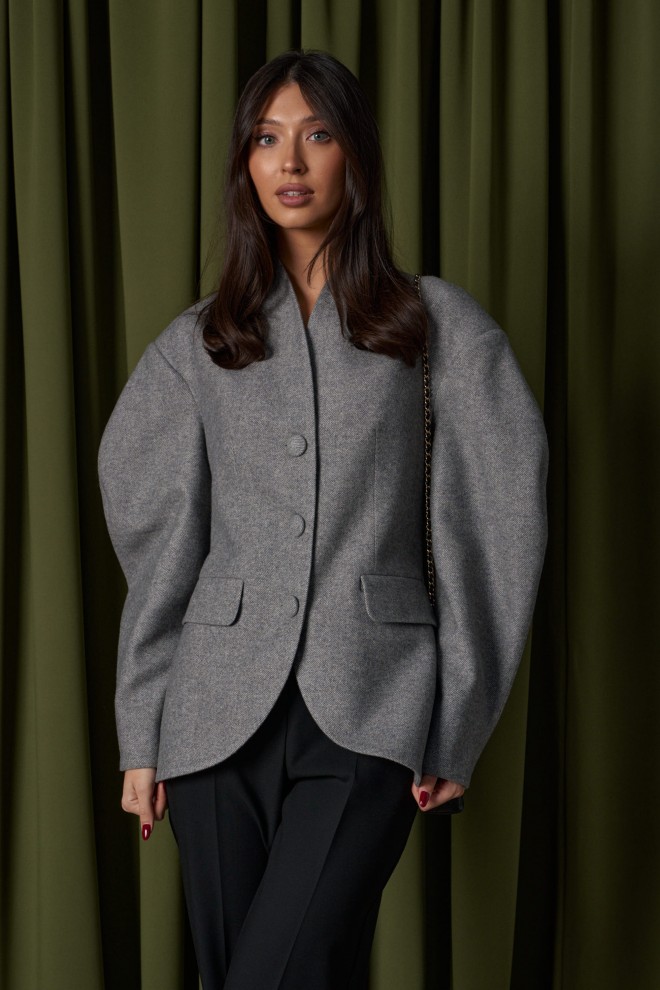 Жакет прилегающего силуэта. Выполнен из фактурного полотна серого цвета. С подкладкой. Воротник-стойка. Вырез горловины V-образный. Рукав втачной, объёмный, заужен к низу. По переду карманы с клапаном. Застёжка центральная - пуговицы. Низ жакета фигурный. Длина спинки 69 см. Длина рукава от линии втачивания 63 см