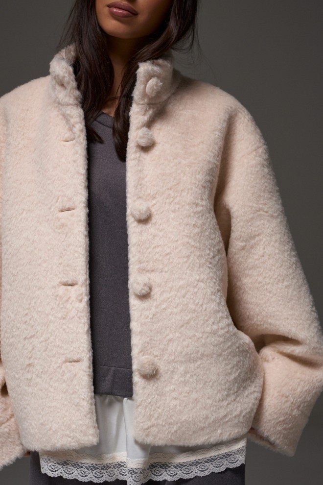 Куртка бежевого цвета, изготовлен из фактурного полотна. Характеристики: прямой крой, воротник-стойка, брендированная подкладка, застежка центральная на петли пуговицы, рукав свободного кроя спущен. Длина по спинке 61 см, длина рукава от края горловины 76 см.