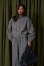 Бомбер серого цвета, выполнен из фактурного полотна. Характеристики: воротник-стойка, застёжка центральная на петли пуговицы, пуговицы выполнены из основной ткани. Брендированная подкладка на утеплении (утеплитель по переду и по спинке, рукава без утеплителя). По переду изделия крупные карманы. Широкий спущеный рукав, без утепления, заканчивается манжетом-резинкой,по низу изделия резинка. Длина по спинке 51 см, длина рукава от горловины 77 см.