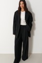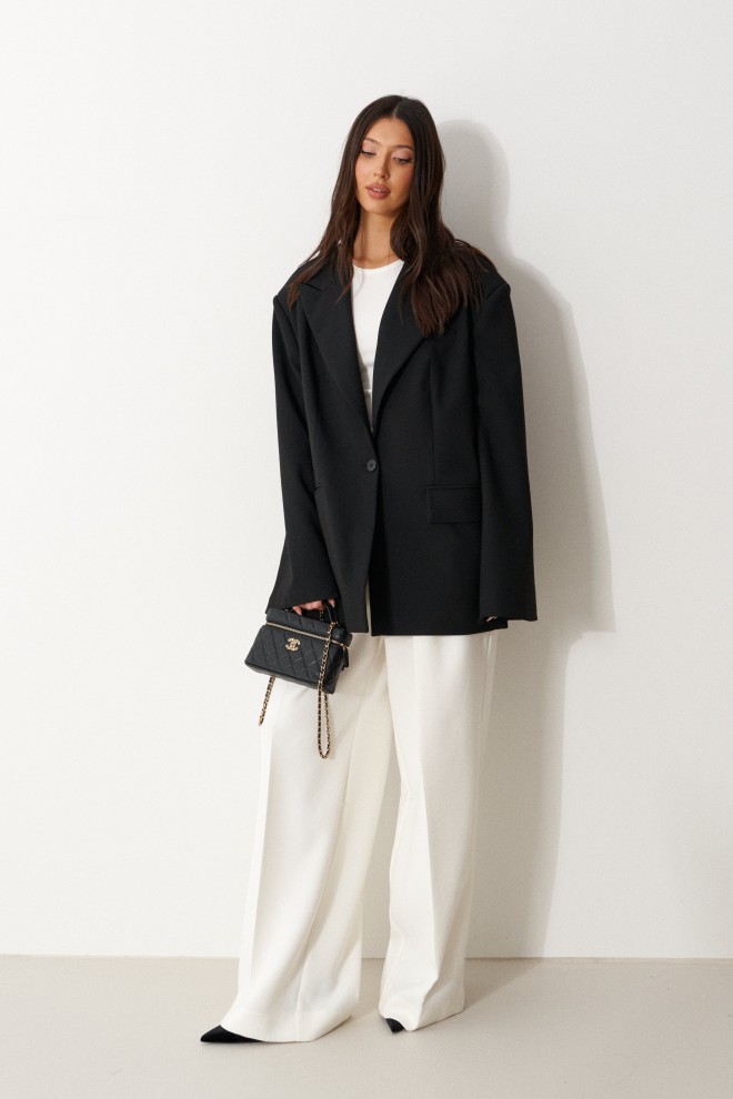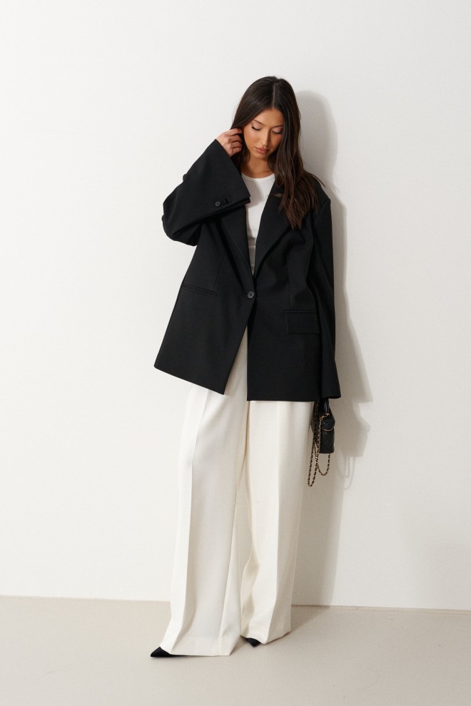Жакет прямого свободного кроя выполнен из костюмной ткани черного цвета. Характеристики: прямой свободный крой, брендированная подкладка, подплечники, воротник с остроугольным лацканом, застежка центральная на петлю - пуговицу, по переду функциональные карманы с клапаном, рукав к низу расклешен, втачной, чуть спущен, по низу рукава нашиты пуговички, спинка цельнокроеная. Длина по спинке 77, длина рукава от края горловины 84 см.