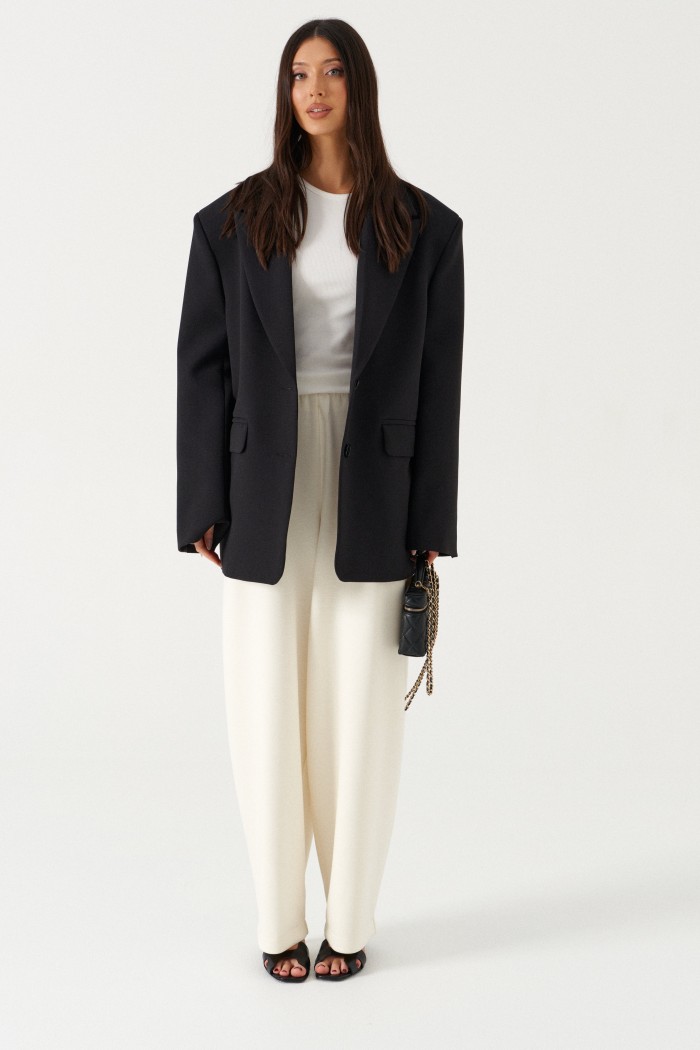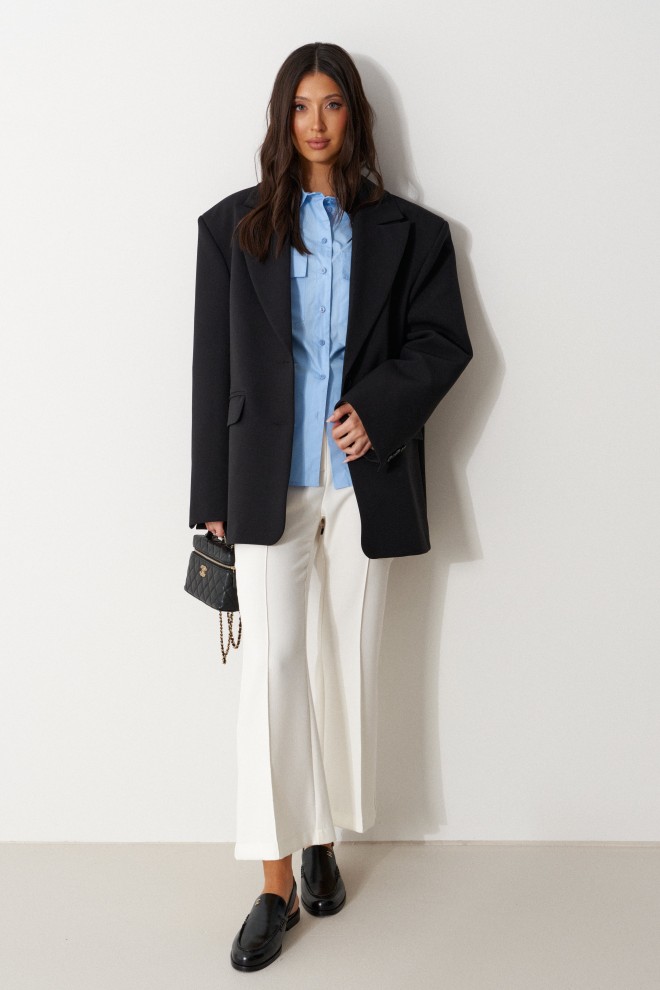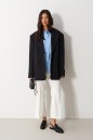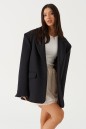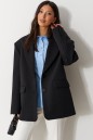 Жакет прямого силуэта, на подкладке. Выполнен из костюмной ткани. Характеристика: воротник пиджачного типа, с лацканами. На переде, по линии таллии, обработаны карманы в рамку с клапаном. Спинка со средним швом заканчивающийся шлицей. Рукав втачной двух шовный. Локтевой шов заканчивающийся шлицей застегивающая на петли и пуговицы. Застежка центральная бортовая, застегивающаяся на две петли, пуговицы. Длина рукава 64 см, длина по спинке 75 см.