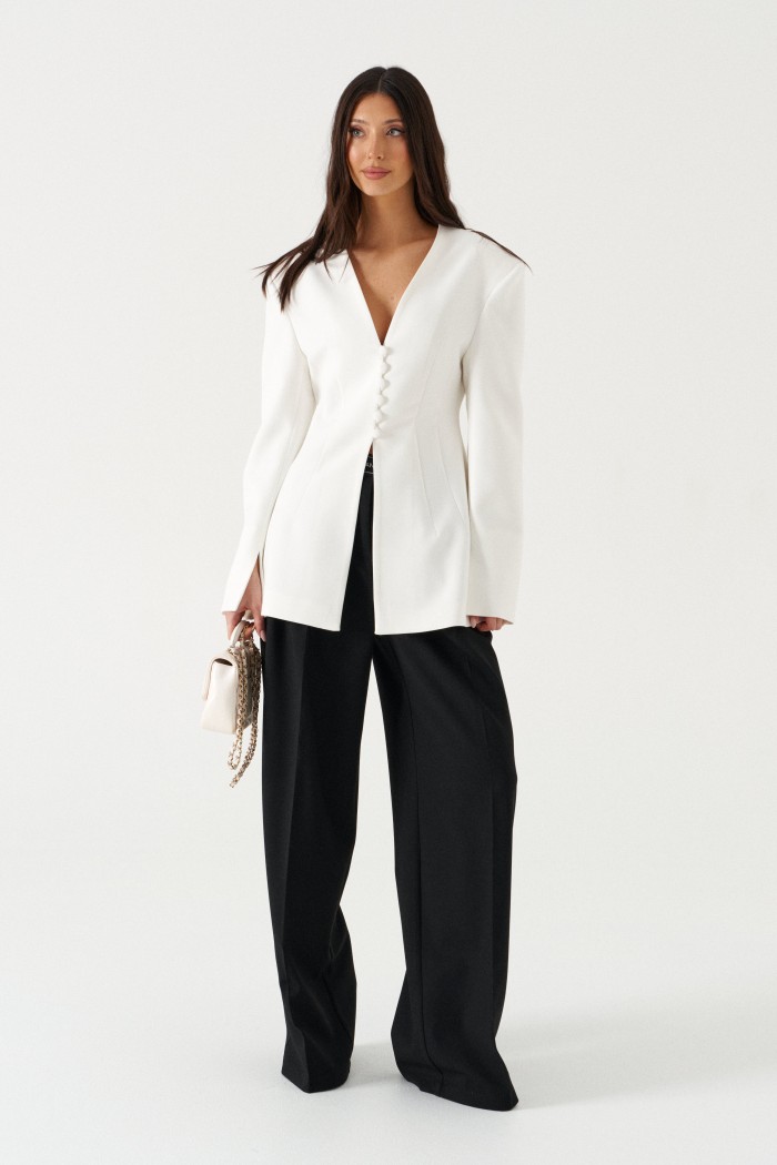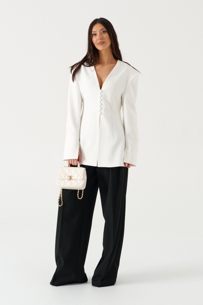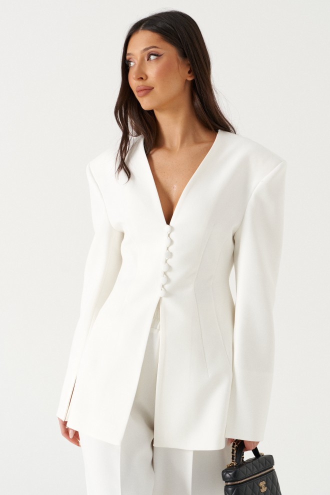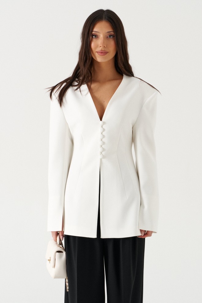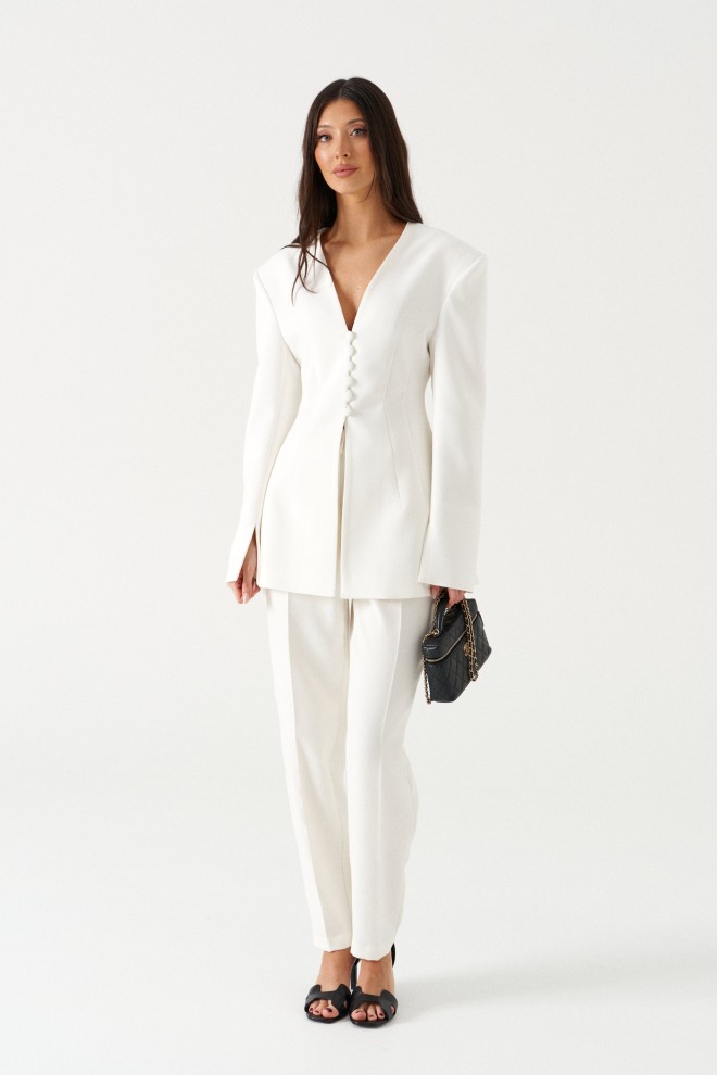 Жакет приталенного силуэта, на подкладке. Выполнен из костюмной ткани белого цвета. Характеристика: горловина V-вырез, на обтачке. По деталям полочек по две талиевые вытачки. Спинка со средним швом и двумя талиевыми вытачками с каждой стороны. Рукав втачной двухшовный. Передний шов заканчивается разрезом. Застежка центральная бортовая, застегивающаяся на навесные петли и пришивные пуговицы. Длина рукава 65 см, длина по спинке 73 см.
