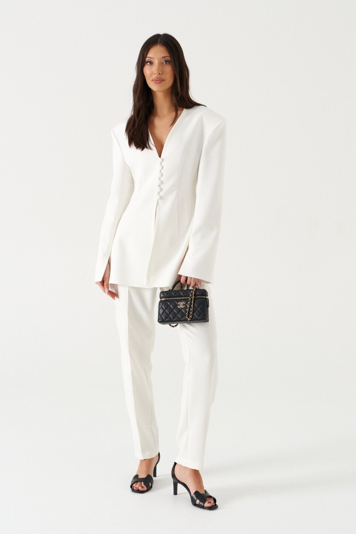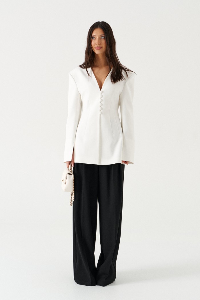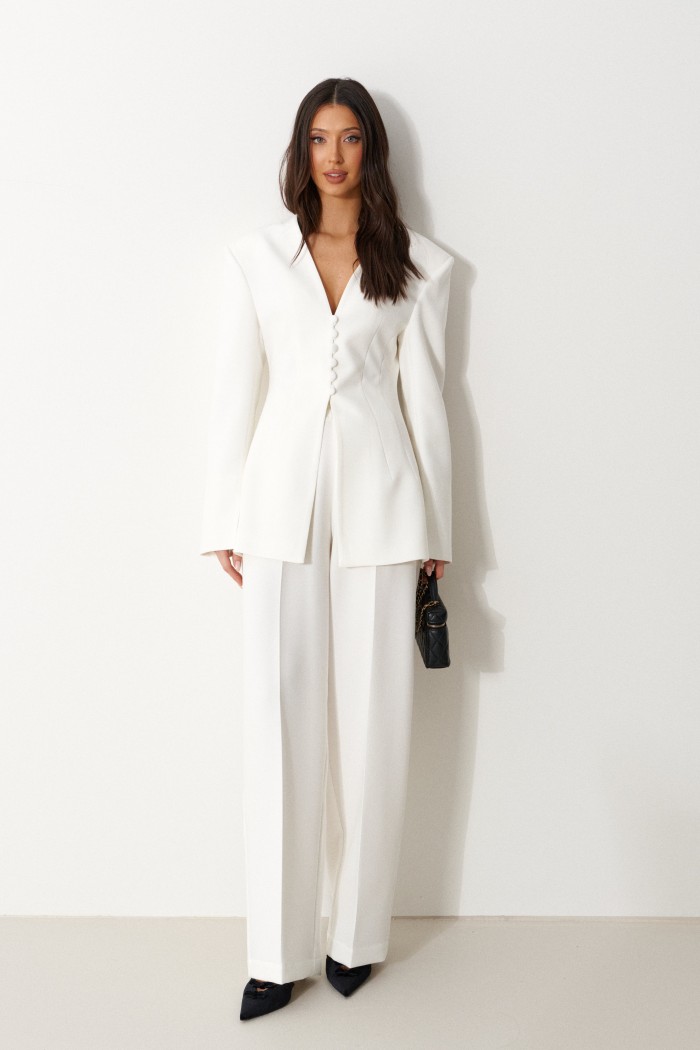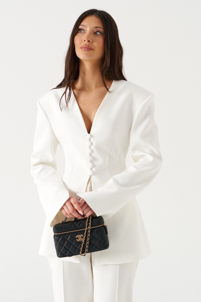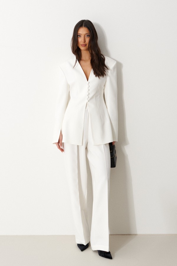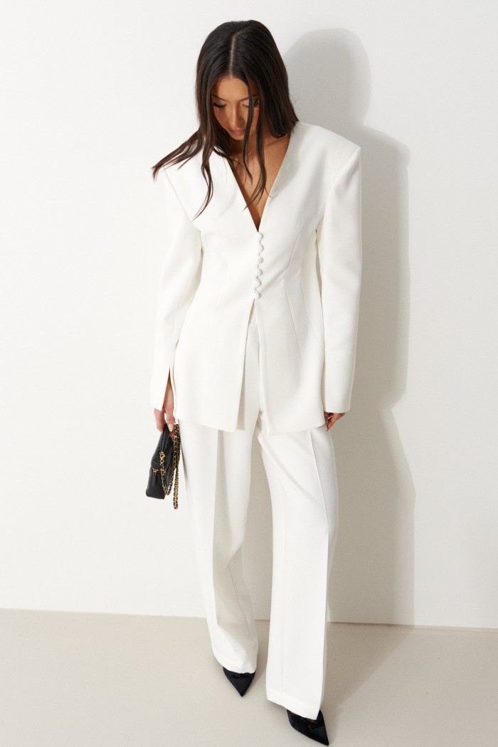 Жакет приталенного силуэта, на подкладке. Выполнен из костюмной ткани белого цвета. Характеристика: горловина V-вырез, на обтачке. По деталям полочек по две талиевые вытачки. Спинка со средним швом и двумя талиевыми вытачками с каждой стороны. Рукав втачной двухшовный. Передний шов заканчивается разрезом. Застежка центральная бортовая, застегивающаяся на навесные петли и пришивные пуговицы. Длина рукава 65 см, длина по спинке 73 см.